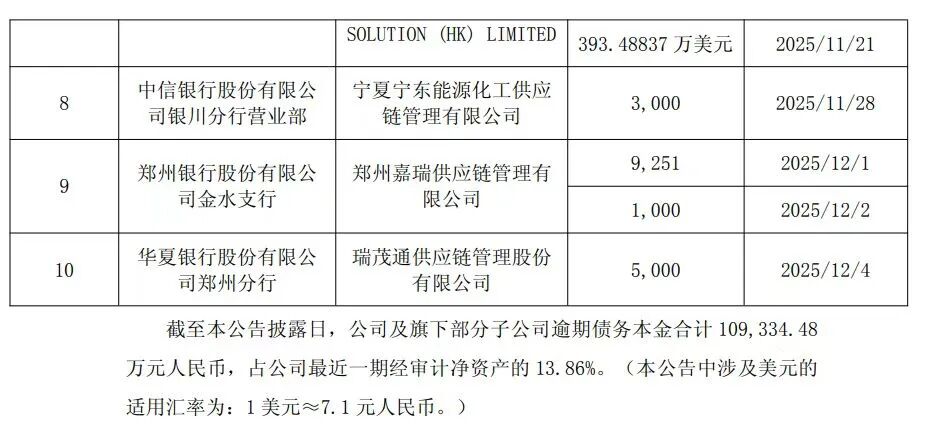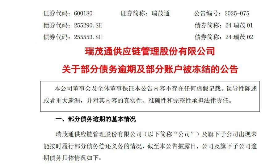 瑞茂通(600180.SH)系“中瑞系”下屬A股上市平臺。12月4日,該公司發布公告,披露公司及旗下子公司逾期債務本金合計高達10.93億元,占最近一期經審計凈資產的13.86%;同時旗下多家聯營企業的股權被司法凍結,2024年這些聯營企業長期股權投資期末余額合計達61.58億元,直接沖擊公司正常經營與資產穩定性。
