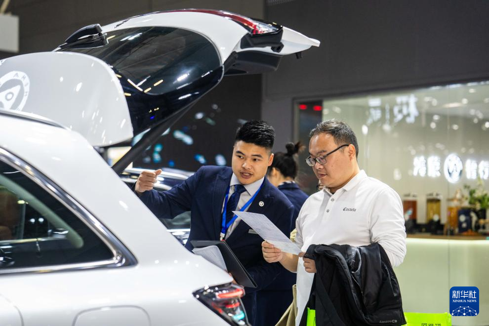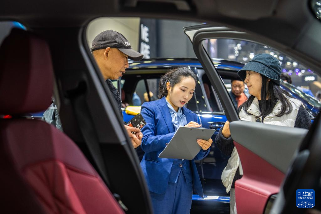 12月10日,在長沙國際會展中心,工作人員(左)在介紹參展車輛。