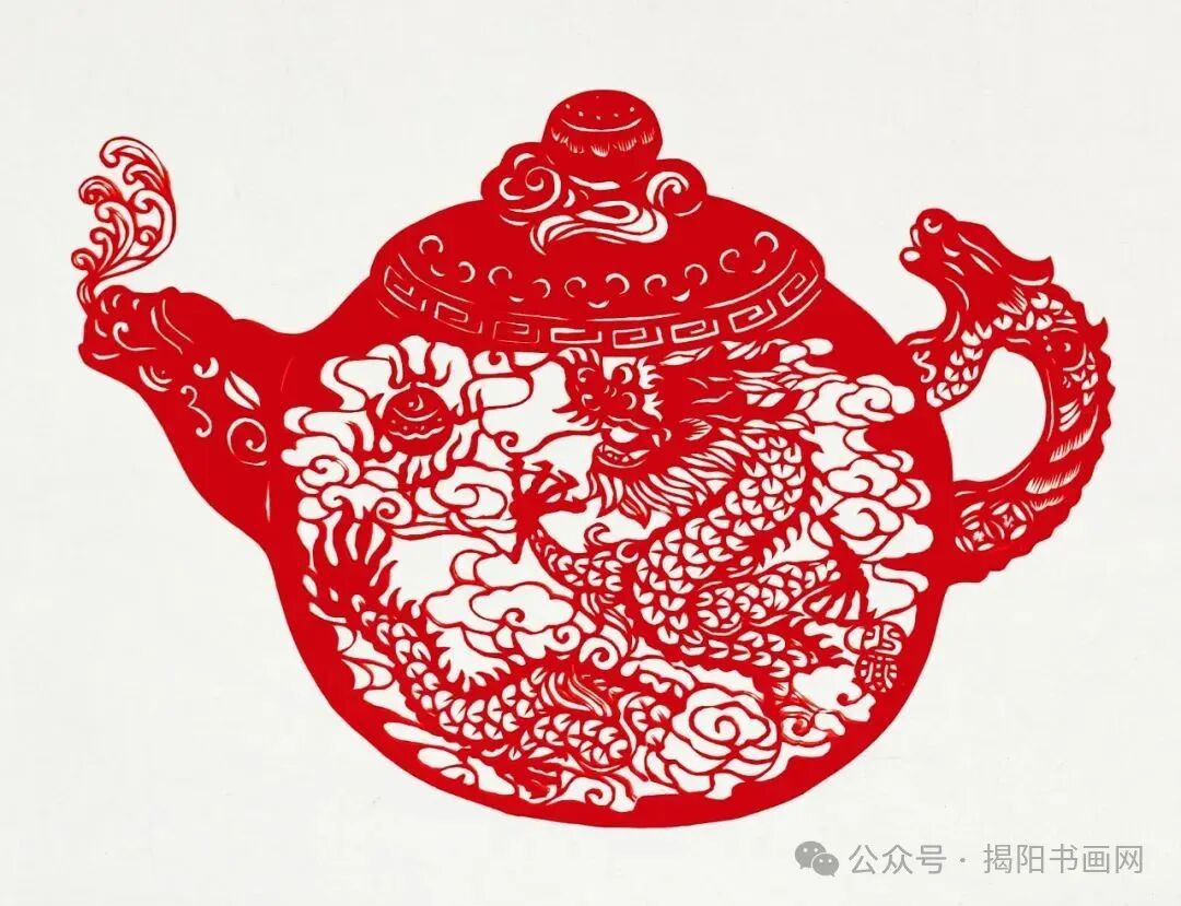 潮陽(yáng)剪紙省級(jí)代表性傳承人鄭少燕的《神龍納福》,仍然延續(xù)往年的“工夫茶”壺造型,作品取“福”與“壺”的諧音,用套嵌式構(gòu)圖,龍的頭部在上方,奔騰飛舞,身軀向上蜷曲作弧形彎曲,呈升起的動(dòng)勢(shì),用繚繞的祥云作為連接;龍頭、四爪、火球用陰剪,龍鱗、背鰭、腹甲和翻卷的云朵用陽(yáng)剪;壺嘴和把手是陰剪的龍頭,把手還飾古錢(qián)紋、鋸齒紋,壺紐用“陰剪”云紋相托,壺蓋的邊緣飾回紋,從而與壺身的龍形成對(duì)應(yīng),尤其是壺嘴還飄出一縷茶香氣裊裊上升,可謂獨(dú)具匠心。一把“物中套花”的“龍壺”顯得格外賞心悅目。