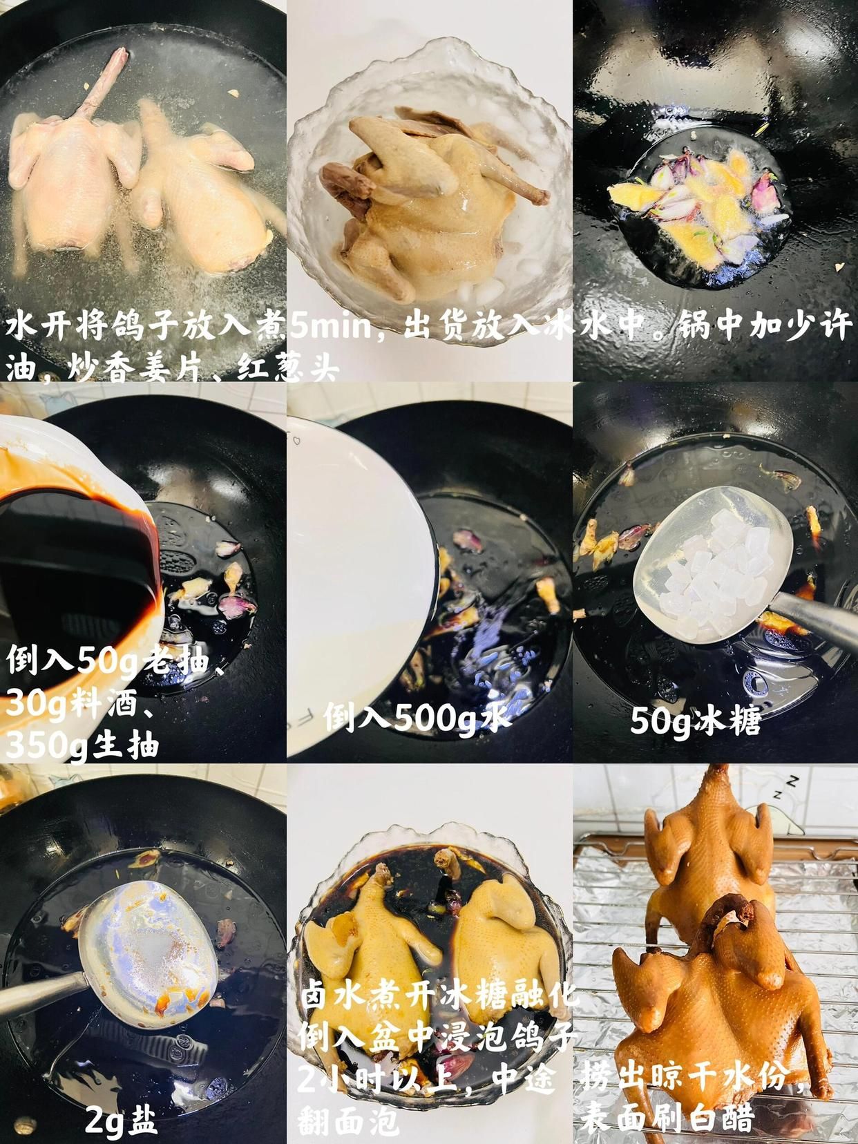 乳鴿2只、洋蔥半個、蒜5瓣、姜5片、蔥段適量、生抽2勺、蠔油1勺、料酒1勺、鹽焗粉1勺、糖1小勺、鹽少許、食用油適量