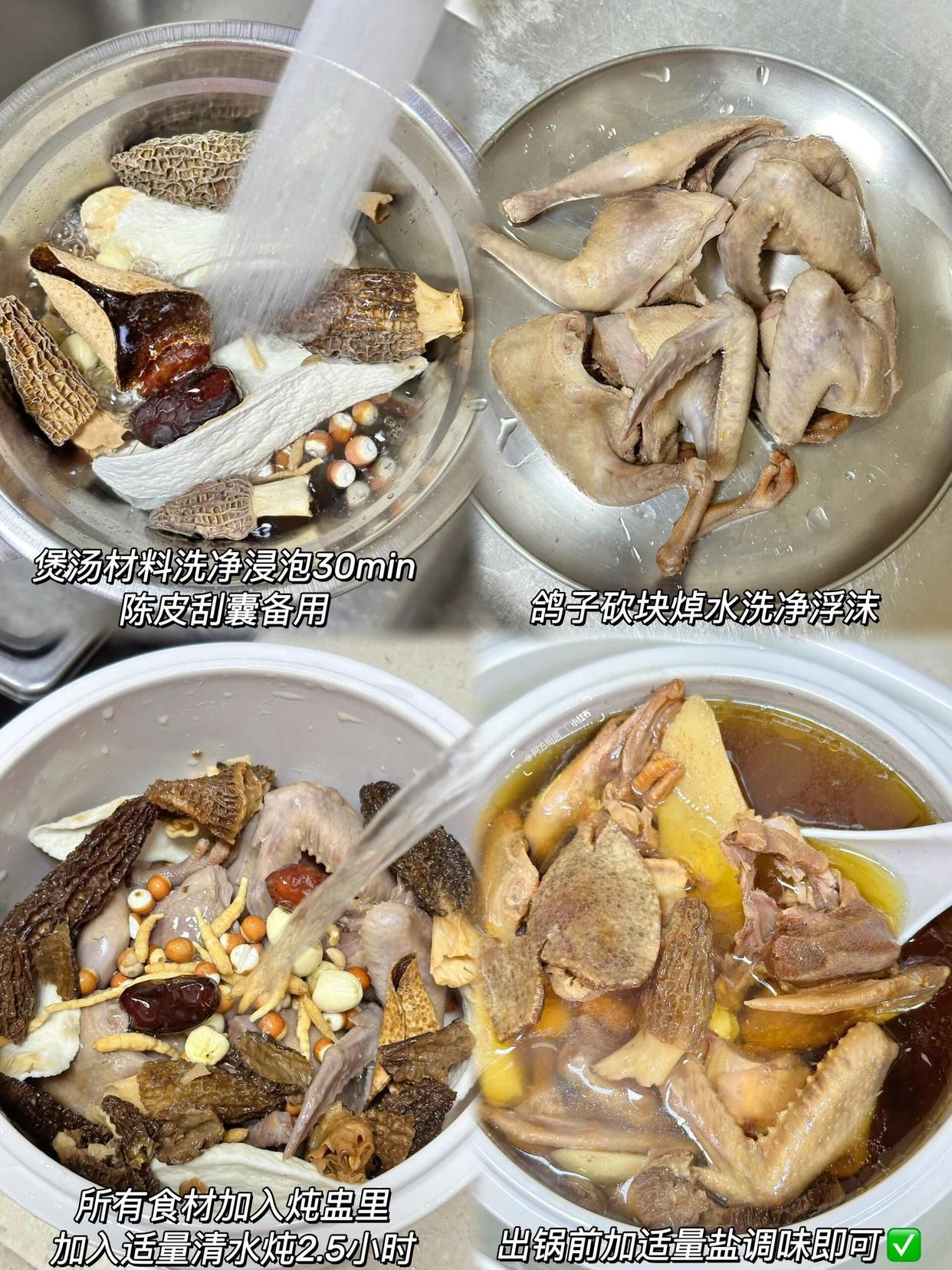 鴿子焯水去除血沫,羊肚菌泡發洗凈,四神食材(淮山干、蓮子、芡實)洗凈備用;所有食材放入砂鍋,加足量清水,大火煮開后轉小火慢燉1.5小時;最后加適量鹽調味,不用加過多調料,保留食材本身的鮮香,湯清味醇,營養全在湯里。
