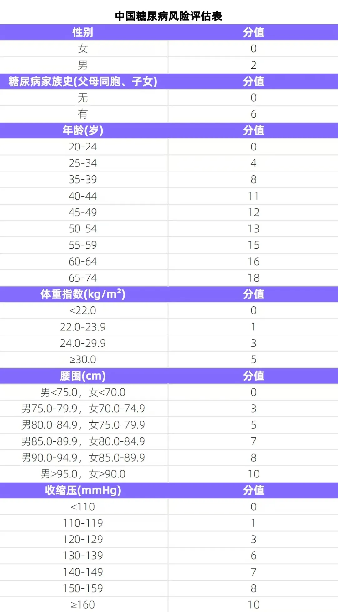 沒過35歲的人,也可以參照《中國糖尿病風險評分表》:若你的評分相加≥25分,請重視自己的血糖檢測。