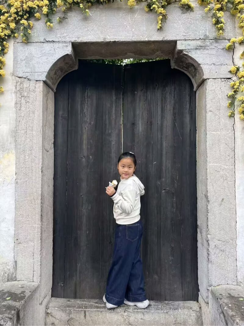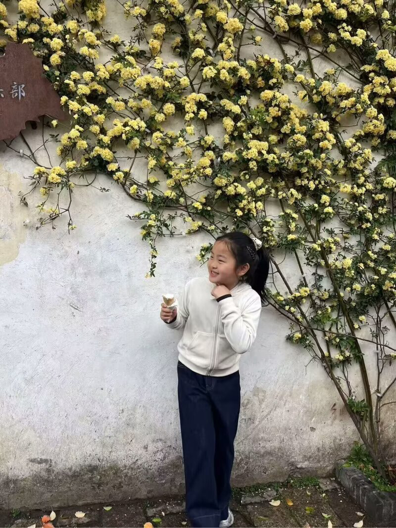 第二天,女兒又發(fā)了他們出游的圖片,其中,有小妹妹站在木香下的照片,也有兩個寶寶和他們小哥哥在一起開心玩耍的圖片。其中還有女兒和她姐姐一起逛街的背影,不知道是誰拍的。現(xiàn)在正是人間四月天,是一年中最美的季節(jié),能在這樣的時候去江南水鄉(xiāng)走走真好!何況,無錫還是中央電視臺春節(jié)晚會的取景地呢?看到小妹妹在木香下可愛的照片,我還寫了幾句打油詩:"路上遇木香,朵朵花兒黃。平常小院里,讓人眼前亮。"現(xiàn)在正是木香盛開的季節(jié),那如瀑布般盛開的花朵真的讓人眼前一亮,小妹妹可愛的造型也讓畫面增色不少。