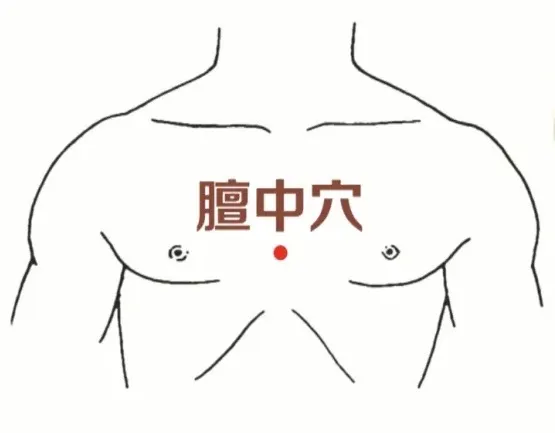 膻中穴位于兩側乳頭正中央。以膻中穴為中心,上下左右輕柔按揉60次即可,力度以微酸脹感為宜。