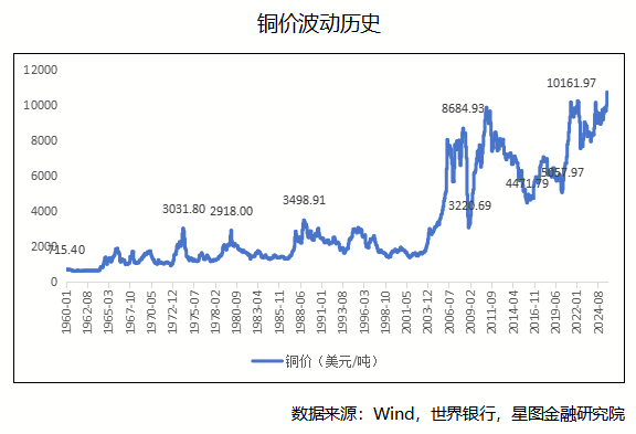 根據(jù)世界銀行記錄,自1960年至今,國際銅價歷經(jīng)六十余年變遷,已從每噸715.40美元攀升至10739.91美元。在此期間,銅價共呈現(xiàn)六次顯著的階段性演變。其長期走勢始終由供需基本面所主導(dǎo),而宏觀流動性環(huán)境則在其中起到了放大價格波動彈性的關(guān)鍵作用。