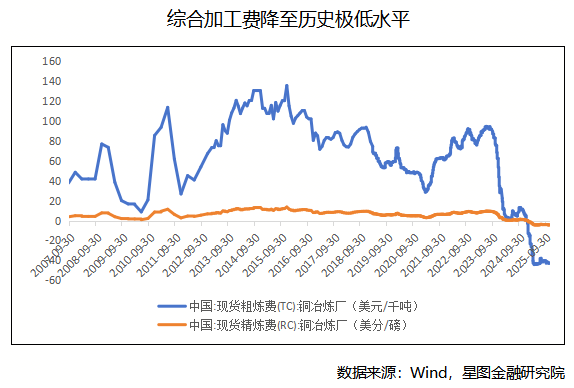 從供應(yīng)側(cè)分析,全球銅礦產(chǎn)能增長正面臨短期運營擾動與長期資本約束的雙重壓力。短短期來看,智利、秘魯?shù)戎饕Y源國頻繁出現(xiàn)生產(chǎn)中斷與社會動蕩,直接影響現(xiàn)有產(chǎn)能釋放。長期而言,行業(yè)資本開支持續(xù)低迷,導(dǎo)致新勘探項目不足、新增產(chǎn)能有限,未來供應(yīng)天花板日益清晰。根據(jù)S&P Global Commodity Insights 2024年報告,1990年至2023年共發(fā)現(xiàn)239個銅礦床,而2014-2023年間僅發(fā)現(xiàn)14個,占比5.9%。供應(yīng)彈性明顯減弱,難以匹配需求增長。這一緊張格局直接反映在銅精礦綜合加工費(TC/RC)上。該費用是衡量銅礦供需的核心指標(biāo):當(dāng)?shù)V石供應(yīng)寬松時,加工費上漲;供應(yīng)緊張時,費用則被壓低以爭奪原料。目前,TC/RC已持續(xù)下降至自2007有數(shù)據(jù)記錄以來的最低水平,直觀印證了銅礦市場的實質(zhì)性短缺,并為銅價提供了堅實的成本支撐。