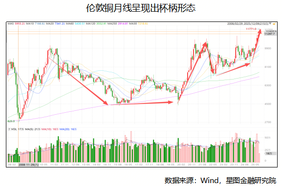 從技術(shù)分析層面觀察,倫敦銅價自2011年起在月線級別構(gòu)筑了一個長達(dá)十余年的巨大“杯柄形態(tài)”。這一經(jīng)典看漲形態(tài)在長期震蕩整理中積蓄動能,直至今年10月,銅價成功向上突破形態(tài)頸線位,標(biāo)志著長達(dá)十余年的整理行情終結(jié),技術(shù)上確認(rèn)進(jìn)入新的上漲階段。考慮到杯底在5000美元/噸,右側(cè)杯沿高點在11000美元/噸,則垂直距離為6000美元/噸,理論目標(biāo)價可能達(dá)到17000美元/噸左右。