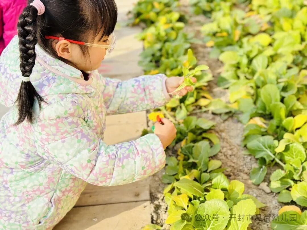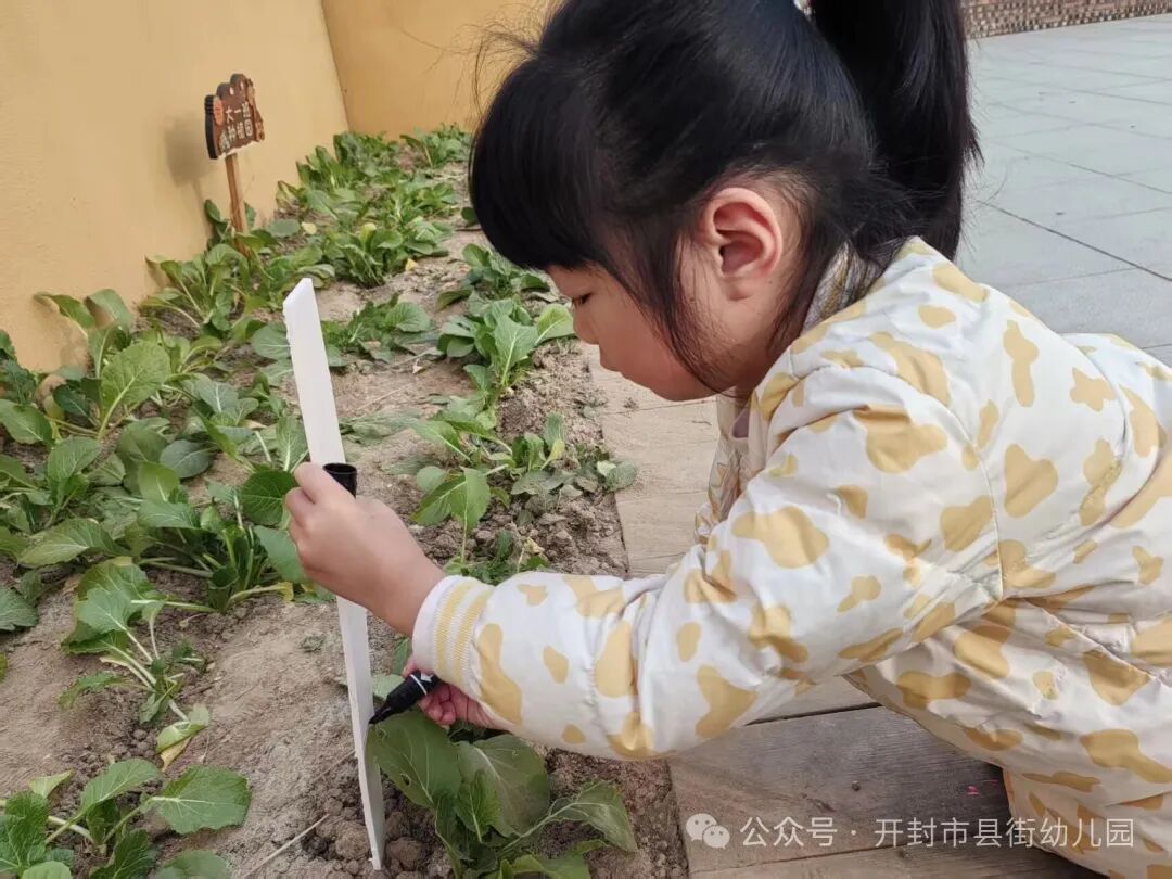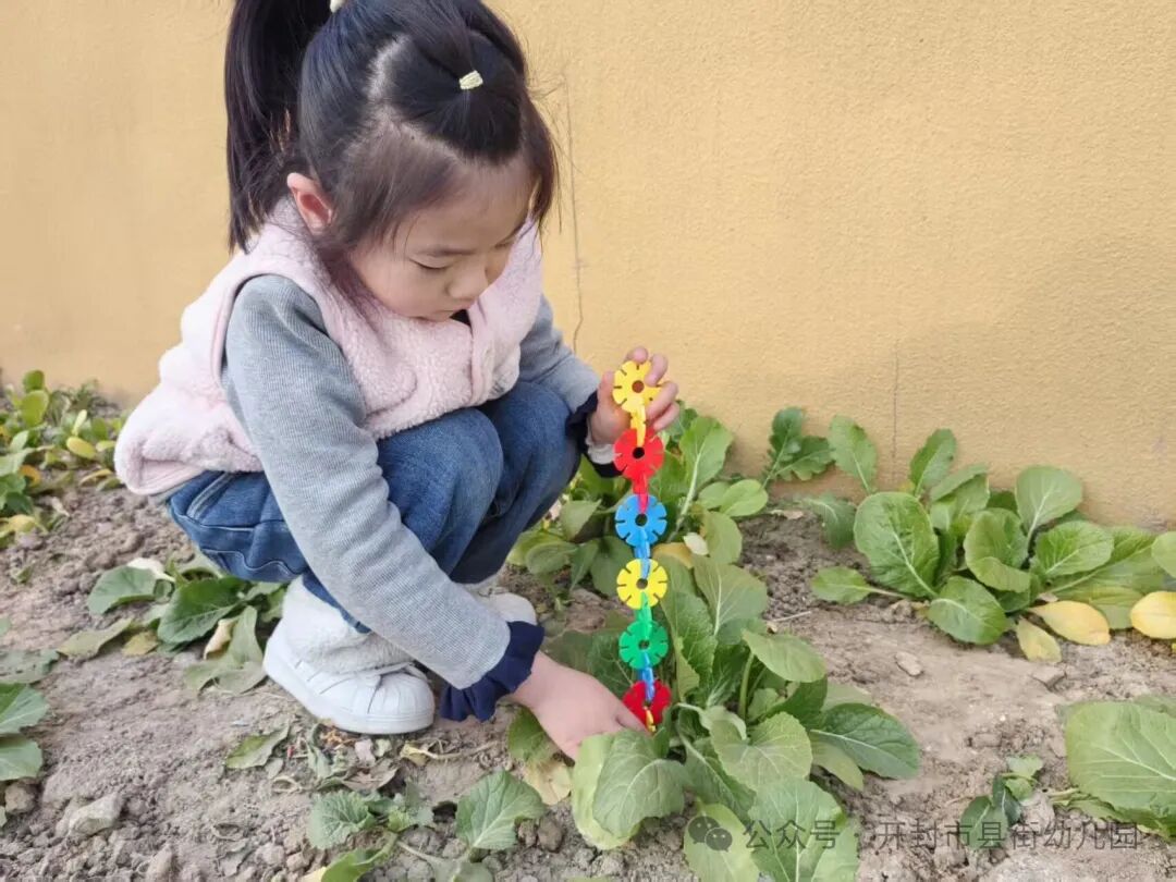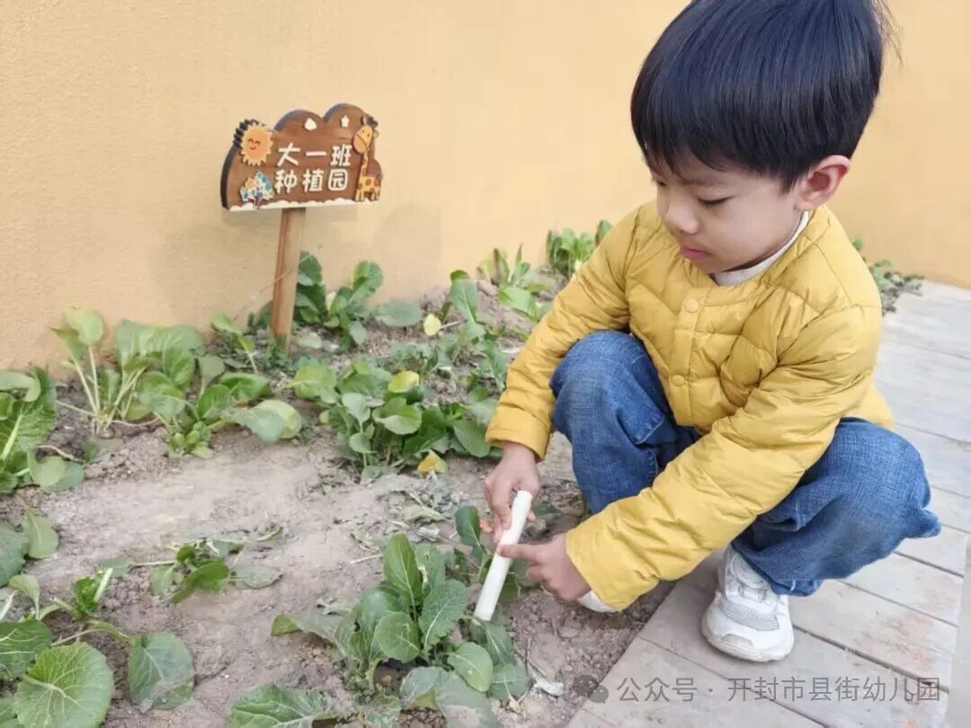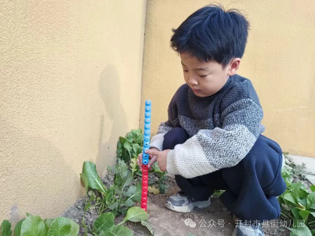 蹲在菜園里,寶貝們用積木、雪花片、紙板等工具丈量油菜高度,歡呼著分享長(zhǎng)勢(shì)變化,靜靜見證綠意舒展,感受勞動(dòng)滋養(yǎng)下的生命力量。