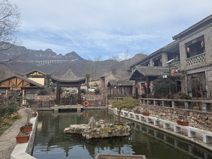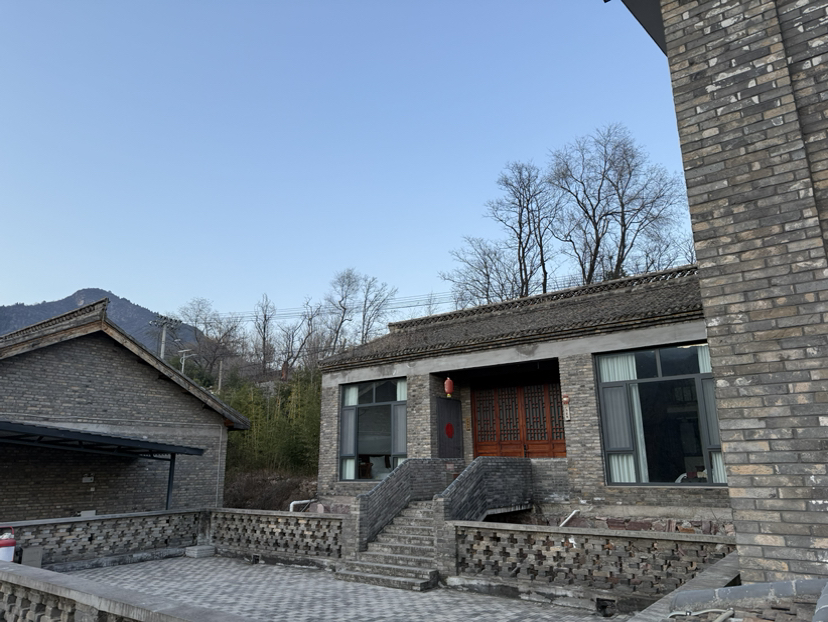 從鄭州自駕兩小時,高速的車流漸遠,山路蜿蜒著嵌入黛色群山。風裹著草木與泥土的清芬漫進車窗,將城市里的空調味徹底滌蕩,越往深處走,連呼吸都變得清潤。剛拐進民宿所在的岔路,視線便被牢牢鎖住:青瓦白墻的老院嵌在青山綠水間,院門口的老樹伸展著蒼勁枝椏,山尖浮著薄云,炊煙從廚房煙囪里慢悠悠升起,"歸園田居" 的意境無需言說,便已浸透眼底。