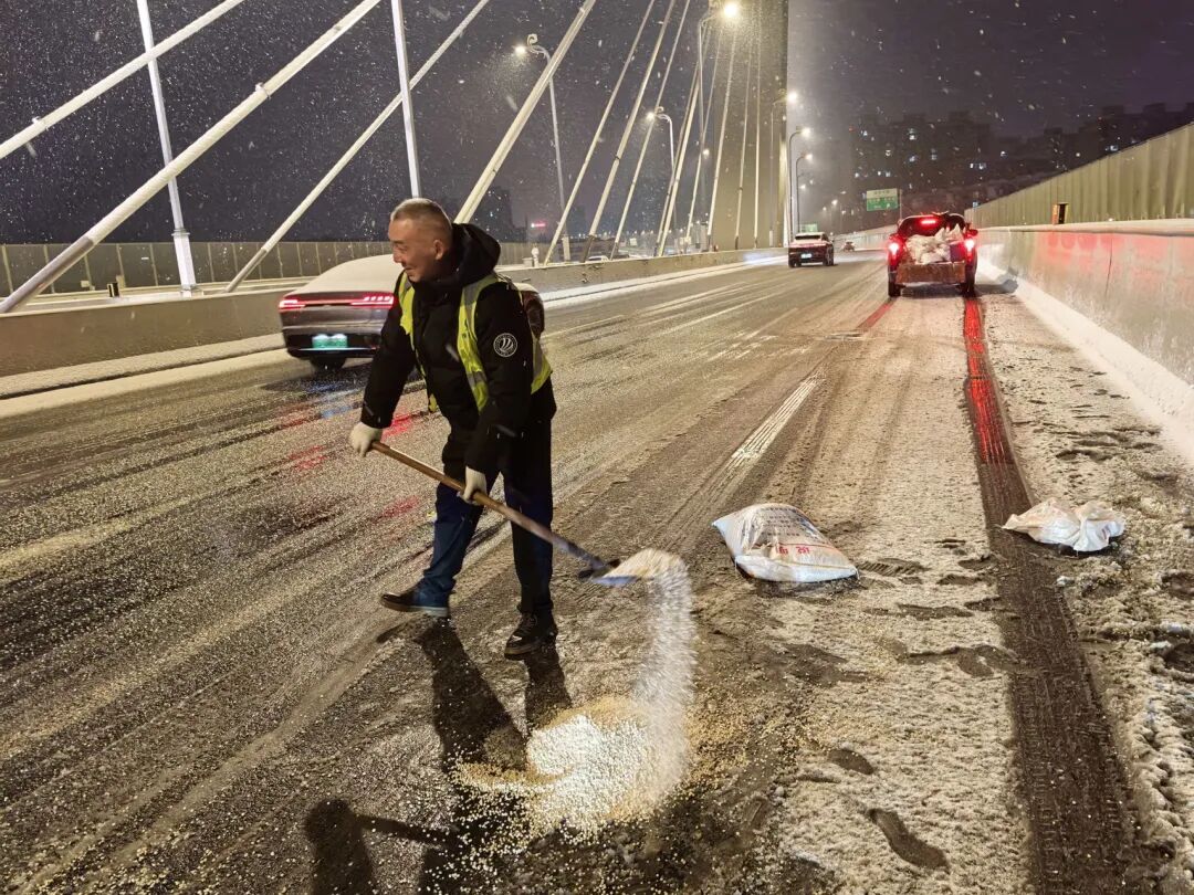 市城管局市政環衛服務中心組織應急隊伍80余人,儲備融雪劑110噸,出動撒布機2臺、各類應急保障車輛4臺,并備有鐵鍬、推雪鏟、草墊等物資。