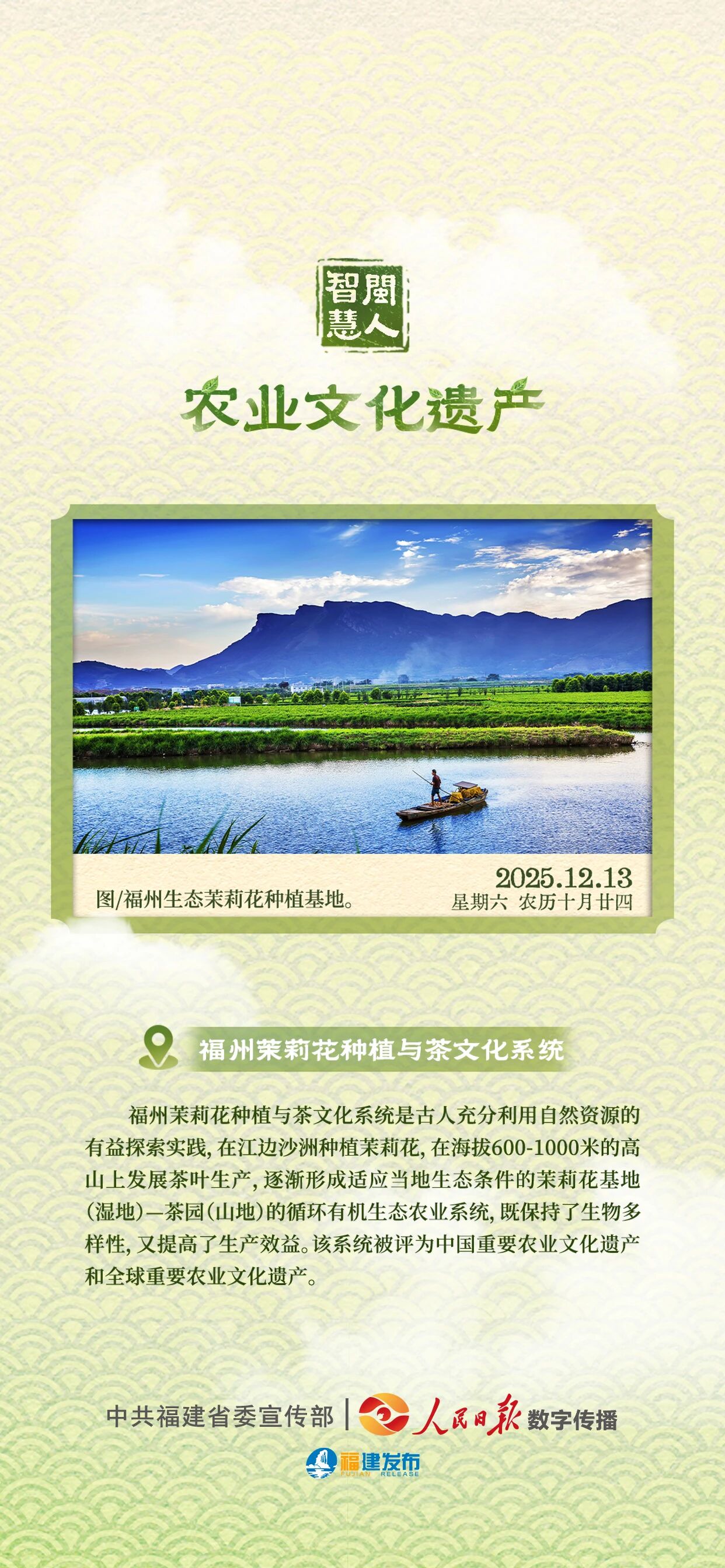 福州茉莉花種植與茶文化系統(tǒng)是古人充分利用自然資源的有益探索實踐,在江邊沙洲種植茉莉花,在海拔600-1000米的高山上發(fā)展茶葉生產(chǎn),逐漸形成適應(yīng)當(dāng)?shù)厣鷳B(tài)條件的茉莉花基地(濕地)—茶園(山地)的循環(huán)有機(jī)生態(tài)農(nóng)業(yè)系統(tǒng),既保持了生物多樣性,又提高了生產(chǎn)效益。該系統(tǒng)被評為中國重要農(nóng)業(yè)文化遺產(chǎn)和全球重要農(nóng)業(yè)文化遺產(chǎn)。