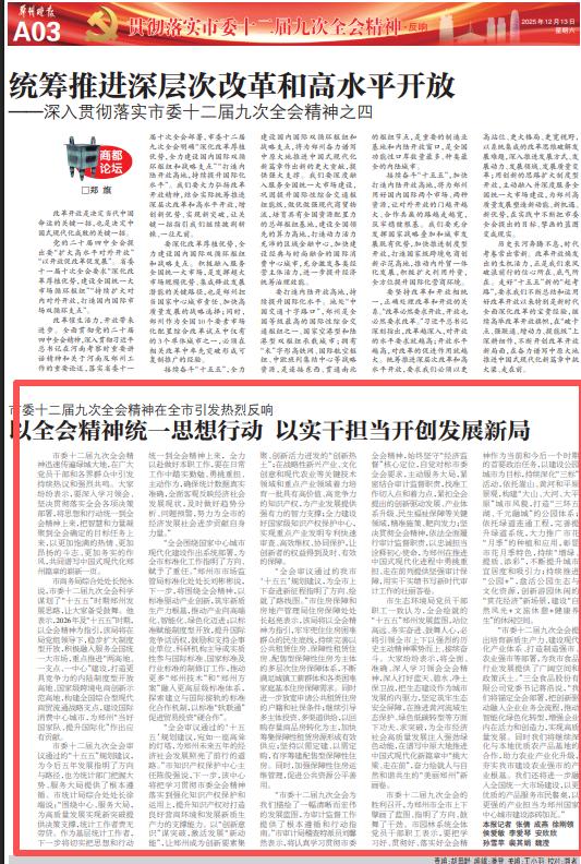 市委十二屆九次全會(huì)精神迅速傳遍綠城大地,在廣大黨員干部和各界群眾中引發(fā)持續(xù)熱議和強(qiáng)烈共鳴。大家紛紛表示,要深入學(xué)習(xí)領(lǐng)會(huì)、堅(jiān)決貫徹落實(shí)全會(huì)各項(xiàng)決策部署,將思想和行動(dòng)統(tǒng)一到全會(huì)精神上來,把智慧和力量凝聚到全會(huì)確定的目標(biāo)任務(wù)上來,以更加飽滿的熱情、更加昂揚(yáng)的斗志、更加務(wù)實(shí)的作風(fēng),共同譜寫中國(guó)式現(xiàn)代化鄭州篇章的嶄新一頁。