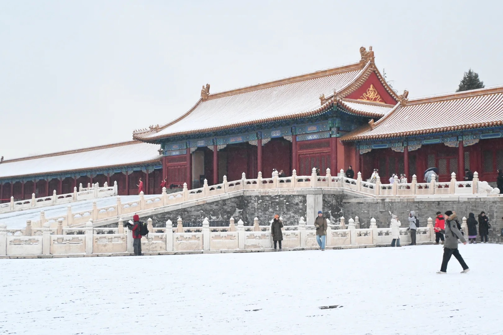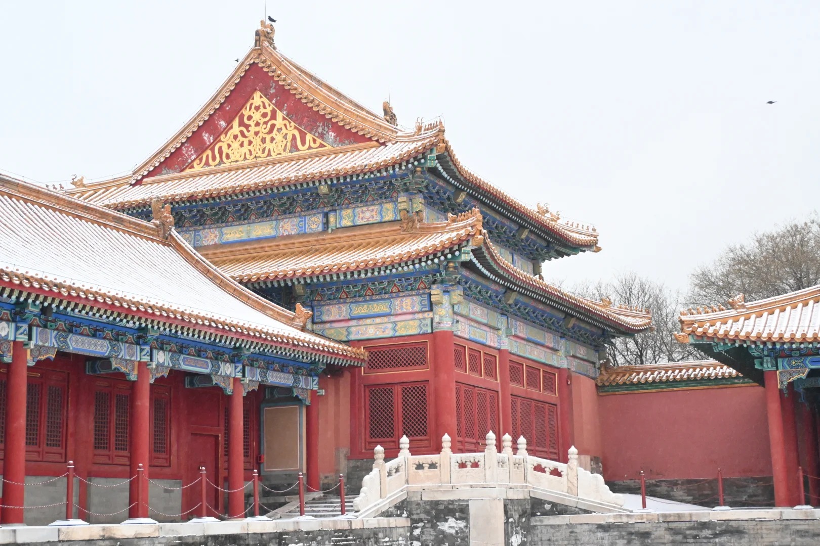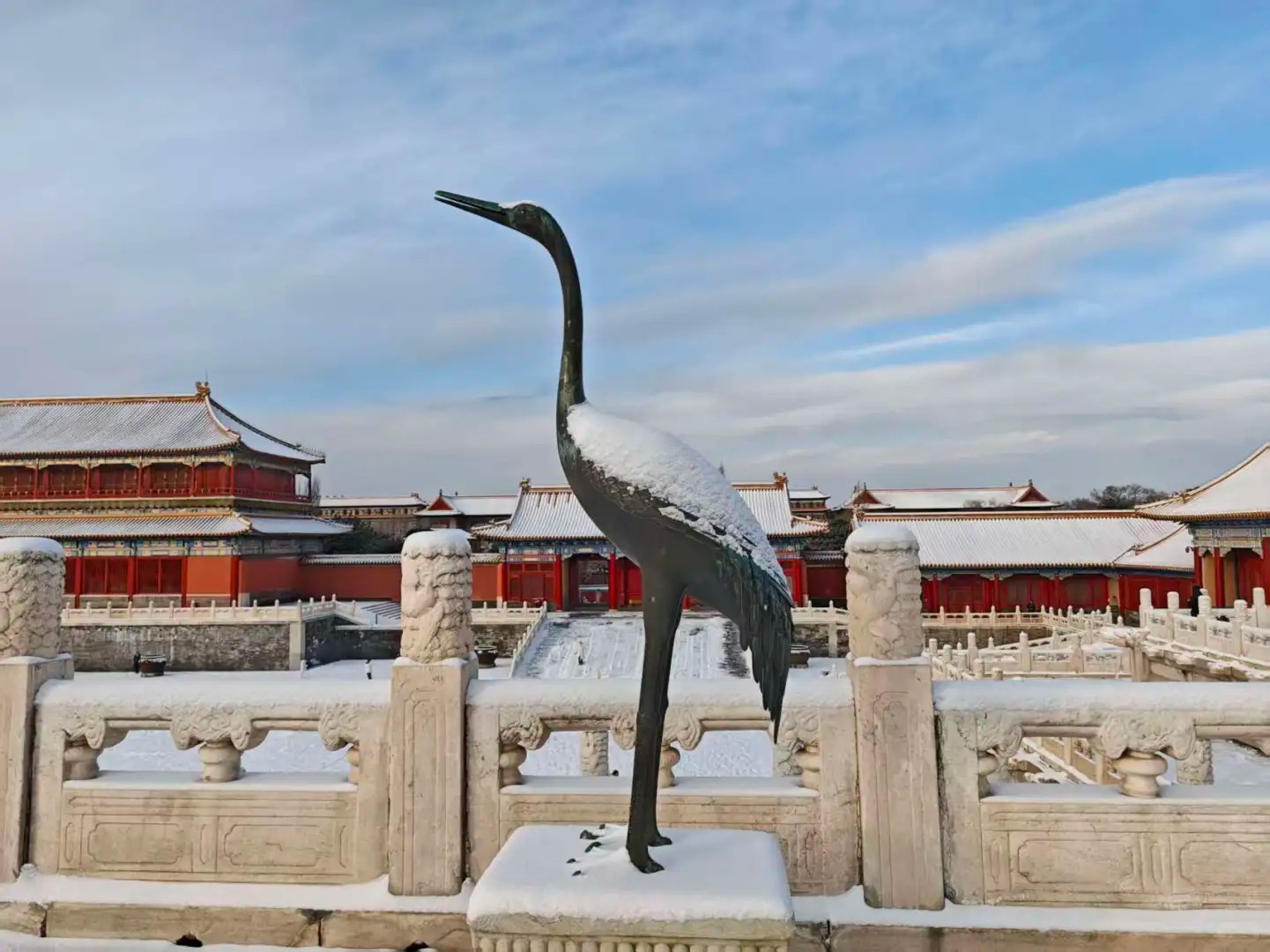 沿著中軸線緩步前行,腳下的雪聲清脆而有韻律。太和殿的重檐廡殿頂鋪滿了雪,檐角的十個脊獸——龍、鳳、獅子、天馬、海馬、狻猊、押魚、獬豸、斗牛、行什——都戴上了雪白的絨帽,靜靜守望著這座雪中宮殿。它們看過多少場這樣的初雪?從永樂十八年落成至今,整整六百零三個冬天,每一片落在它們身上的雪花,是否都記著一段不曾言說的往事?