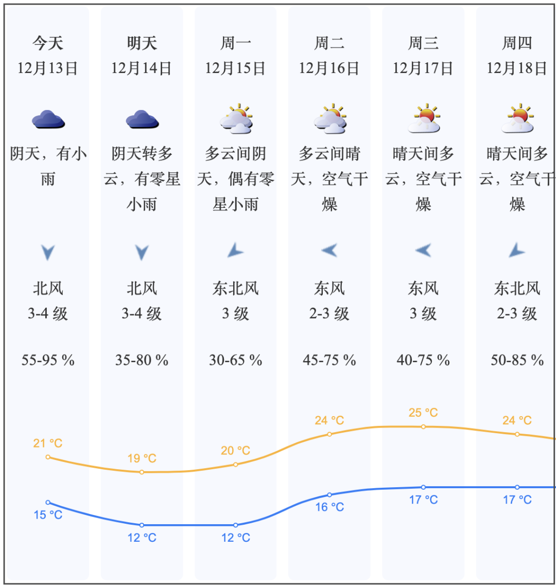 13日全省氣溫持續(xù)下降,傍晚氣溫會(huì)比早上更低。過(guò)程最低氣溫將出現(xiàn)在14日或15日早晨: