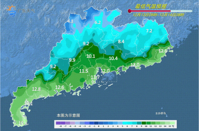 粵北及珠三角北部最低氣溫僅4-8℃,高海拔山區(qū)甚至在0℃左右,局部有霜凍或冰凍;南部沿海市縣也降至13-15℃。