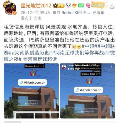 第四、根據(jù)河南知名媒體博主星光燦爛2012消息,納薩里奧在社交媒體發(fā)布出租公告,自己在巴西的海景房要出租,難道這個(gè)假期他們留在河南過年了,尤其是在昨天河南迎來了2025的第一場(chǎng)大雪,納薩一家?guī)卓谝彩菑氐椎拿允г诹诵腋!g快的喜悅中。