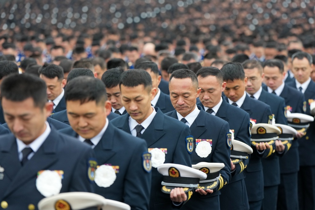 12月13日,南京大屠殺死難者國(guó)家公祭儀式現(xiàn)場(chǎng)。防空警報(bào)拉響,現(xiàn)場(chǎng)默哀。新華社 圖