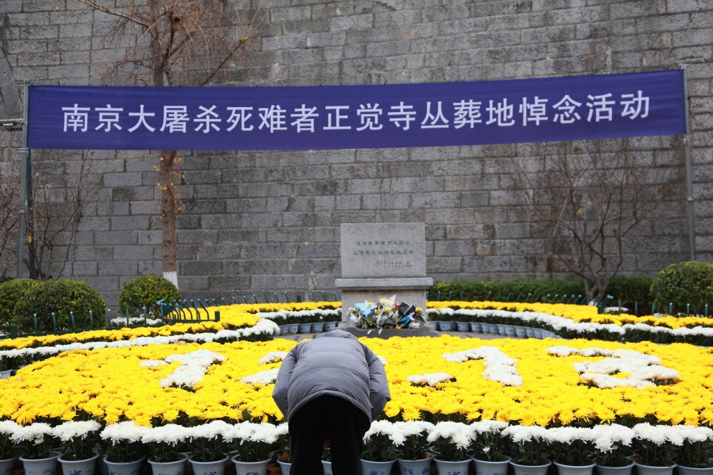 12月12日,市民在侵華日軍南京大屠殺死難同胞叢葬地悼念遇難同胞。