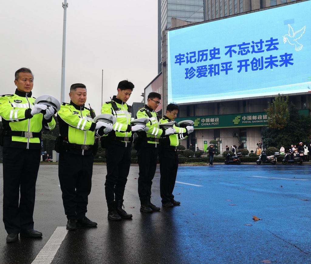 12月13日,南京,市民和警民在街頭駐足默哀。