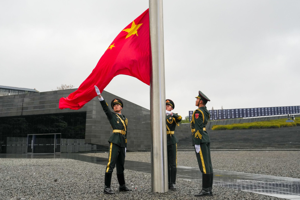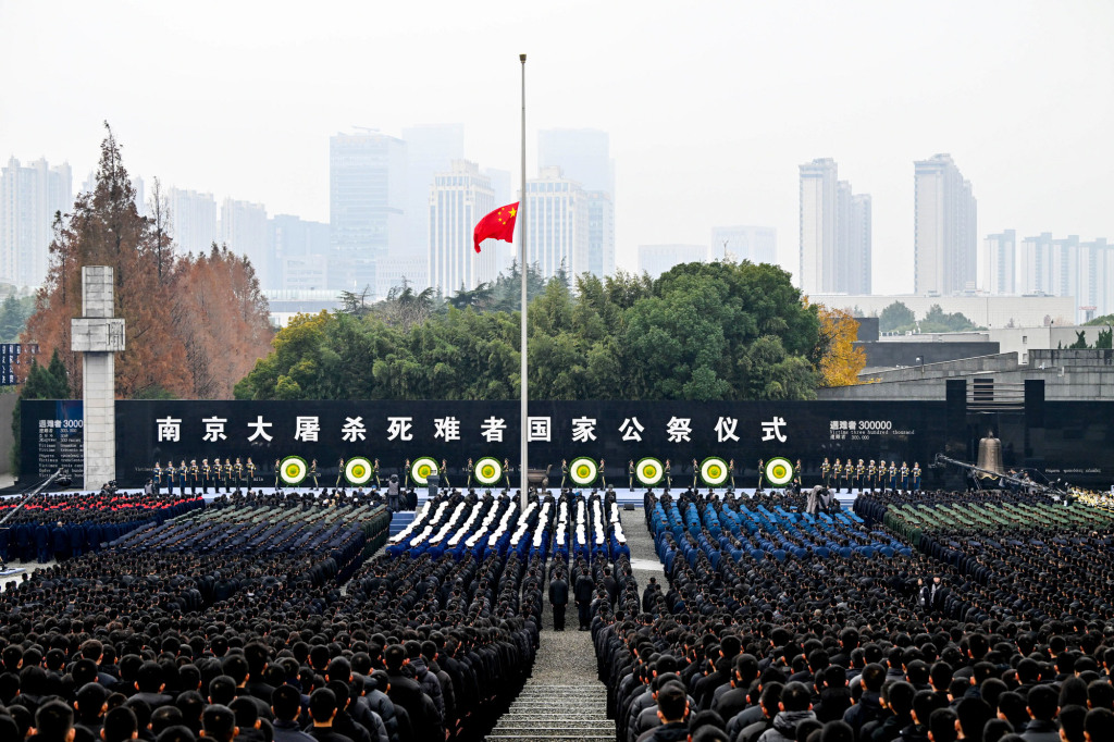 12月13日,侵華日軍南京大屠殺遇難同胞紀(jì)念館舉行升國(guó)旗和下半旗儀式。新華社 圖