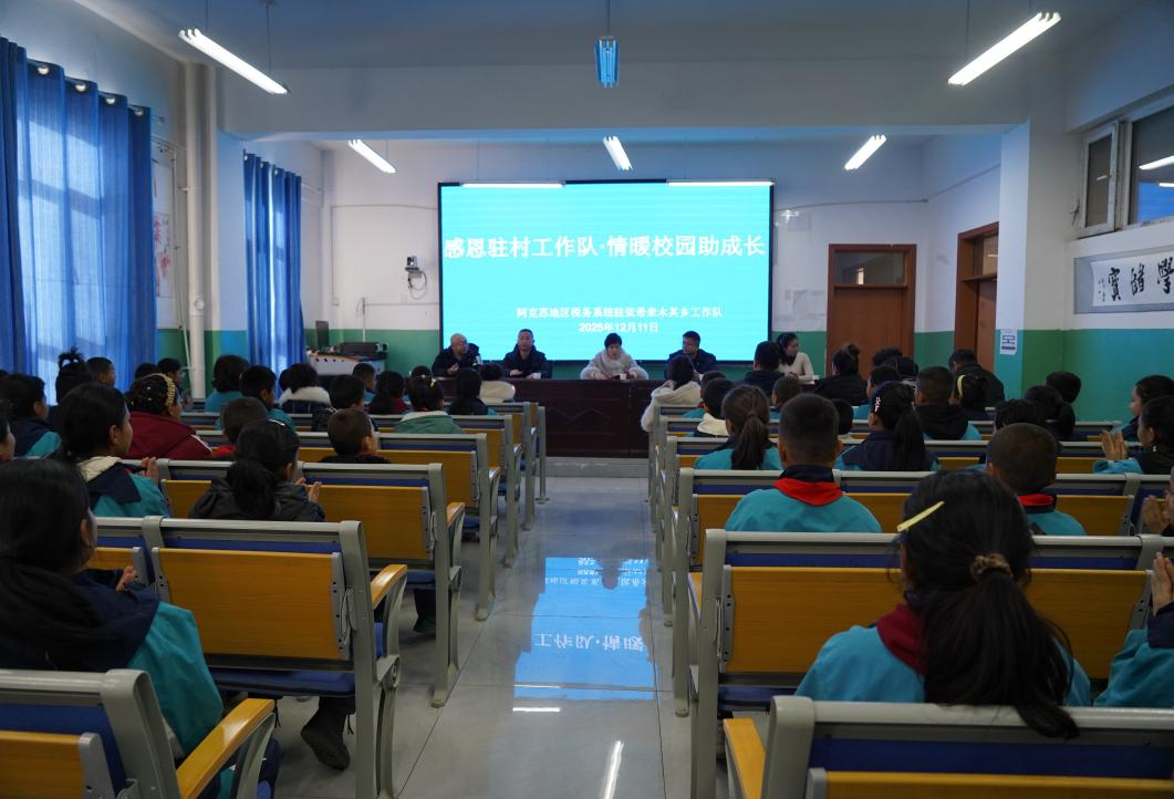 12月11日,溫宿縣依希來木其鄉中心小學的校園里暖意融融,阿克蘇地區稅務局聯合溫宿縣稅務局派駐依稀來木其鄉的7支駐村工作隊在此舉行愛心助學捐贈儀式。簡樸的儀式現場,嶄新的宿舍儲物柜整齊排列,映照著師生們臉上的欣喜笑容,一份承載著稅務干部深情的愛心在此傳遞。