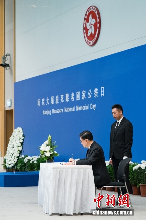 12月13日是南京大屠殺死難者國家公祭日。香港特區政府當天在特區政府總部舉行儀式,悼念南京大屠殺死難者。香港特區行政長官李家超、特區政府主要官員、中央駐港機構代表、青年學生代表等出席儀式。圖為李家超(坐者)簽署紀念冊。