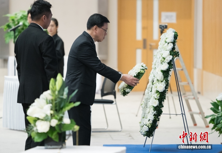 12月13日是南京大屠殺死難者國家公祭日。香港特區政府當天在特區政府總部舉行儀式,悼念南京大屠殺死難者。香港特區行政長官李家超、特區政府主要官員、中央駐港機構代表、青年學生代表等出席儀式。圖為李家超(右一)致獻花圈。