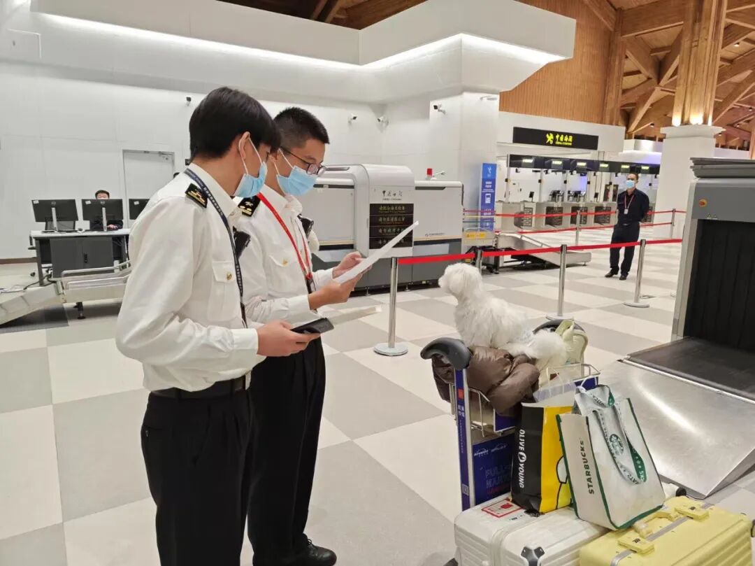 12月8日,海口海關(guān)所屬三亞機(jī)場(chǎng)海關(guān)關(guān)員對(duì)旅客攜帶入境寵物犬開(kāi)展檢疫工作。