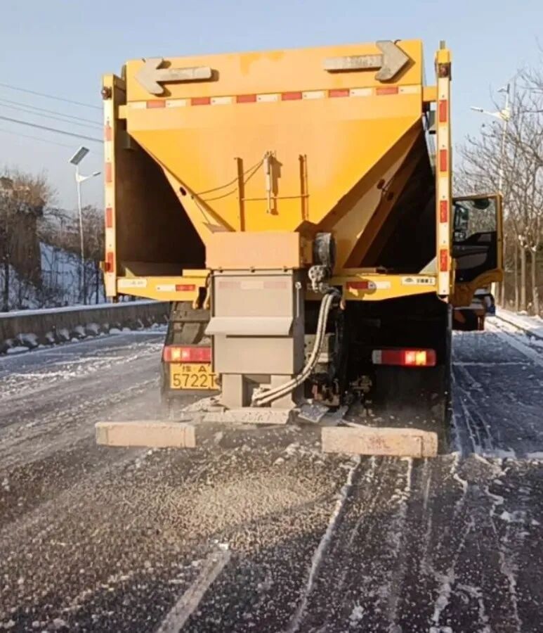 市城建局第一時間調集撒布機、鏟車、雪滾車、刮平機等專業除雪設備,按照預定路線及除雪方案,對轄區內主干道、橋梁、坡道等重點區域展開機械除雪與融雪劑撒布的聯合作業。