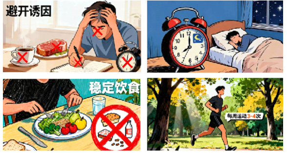 定時定量,避免因饑餓誘發頭痛,多喝水(每天1500-2000ml),少碰高糖、高鹽、辛辣食物。