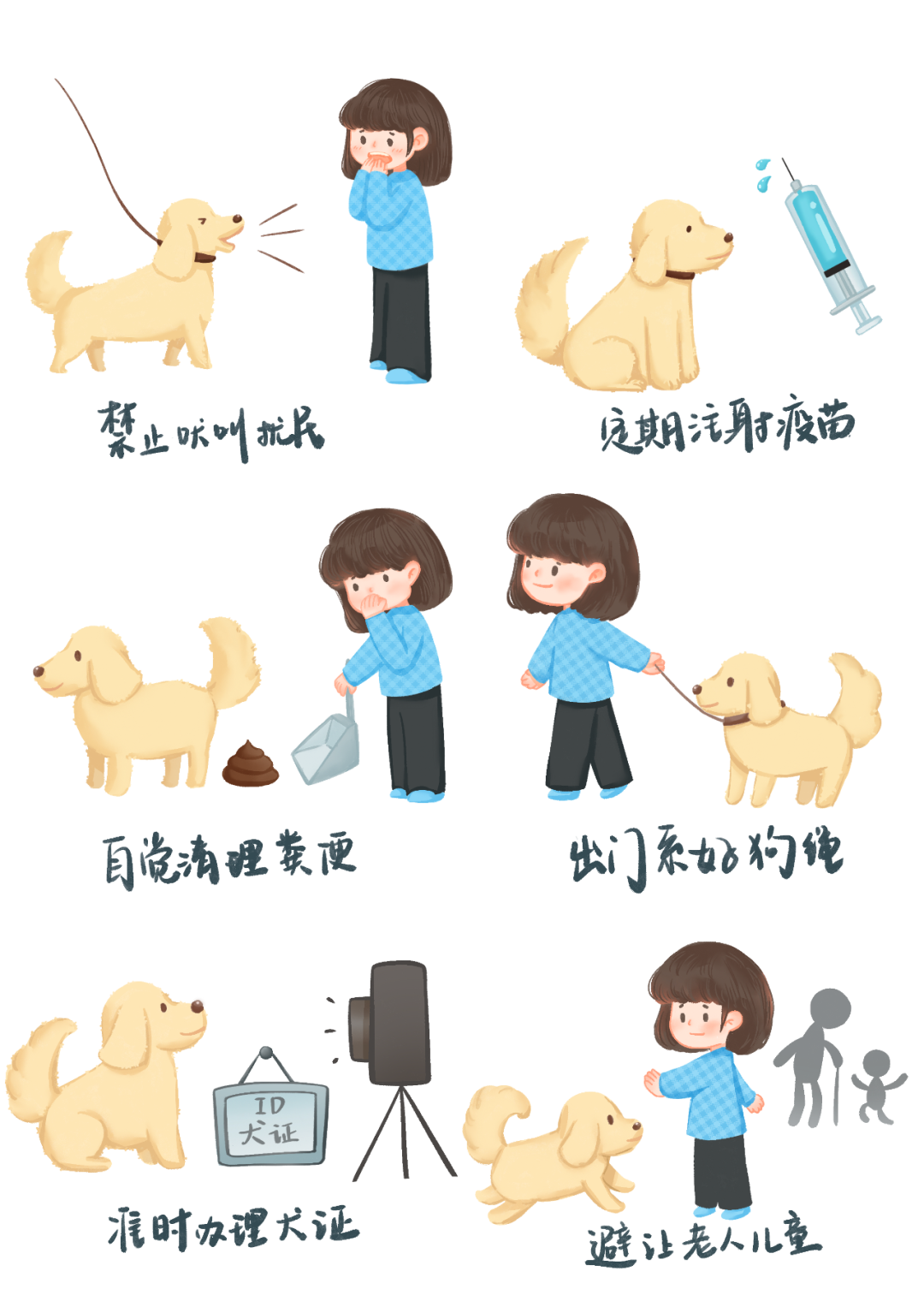 行為規范:主動避讓老人、孕婦、兒童,避免在禁遛區(學校、醫院等)遛犬,深夜控制犬吠避免擾民。