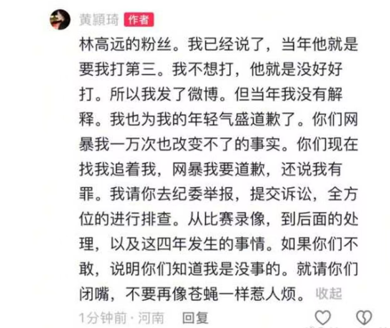 黃頴琦的第一條社交媒體是:“1打4什么感覺?”,第二條是:“善惡終有報,天道好輪回。”在輸球之后,發表這樣的言論顯然是非常不理智和合適的。可是在時隔多年之后,黃頴琦和球迷又因為這個事情和球迷吵起來,當球迷認為她不感恩,如果不是林高遠帶著她拿到了第4,她是拿不到保送北體大名額的時候,黃頴琦也是“火力全開”,甚至劍指林高遠打假球,因為她在長文中表示:“林高遠(他)當年就是要我打第3名,我不想打,他就是沒好好打。”