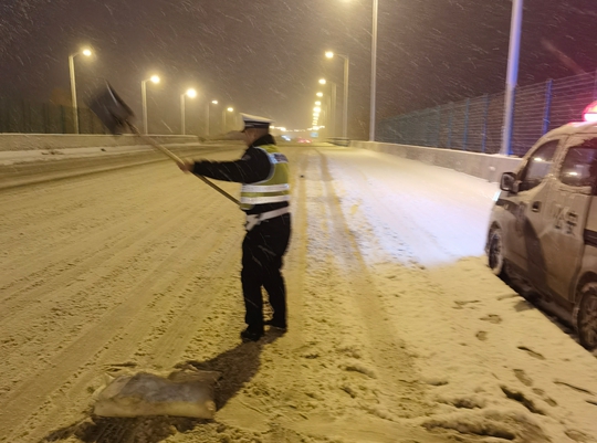為有效應對大雪天氣對道路帶來的影響,全力預防交通事故的發生,全面保障群眾出行安全,針對此輪大范圍降雪天氣,中牟交警以雪為令,聞雪而動,立即啟動惡劣天氣應急預案,連續下發多條指令,警車出動,警燈閃爍,在全面加強道路巡邏防控的同時,還加大護學崗、高峰崗執勤保通和對有難群眾救援的力度。