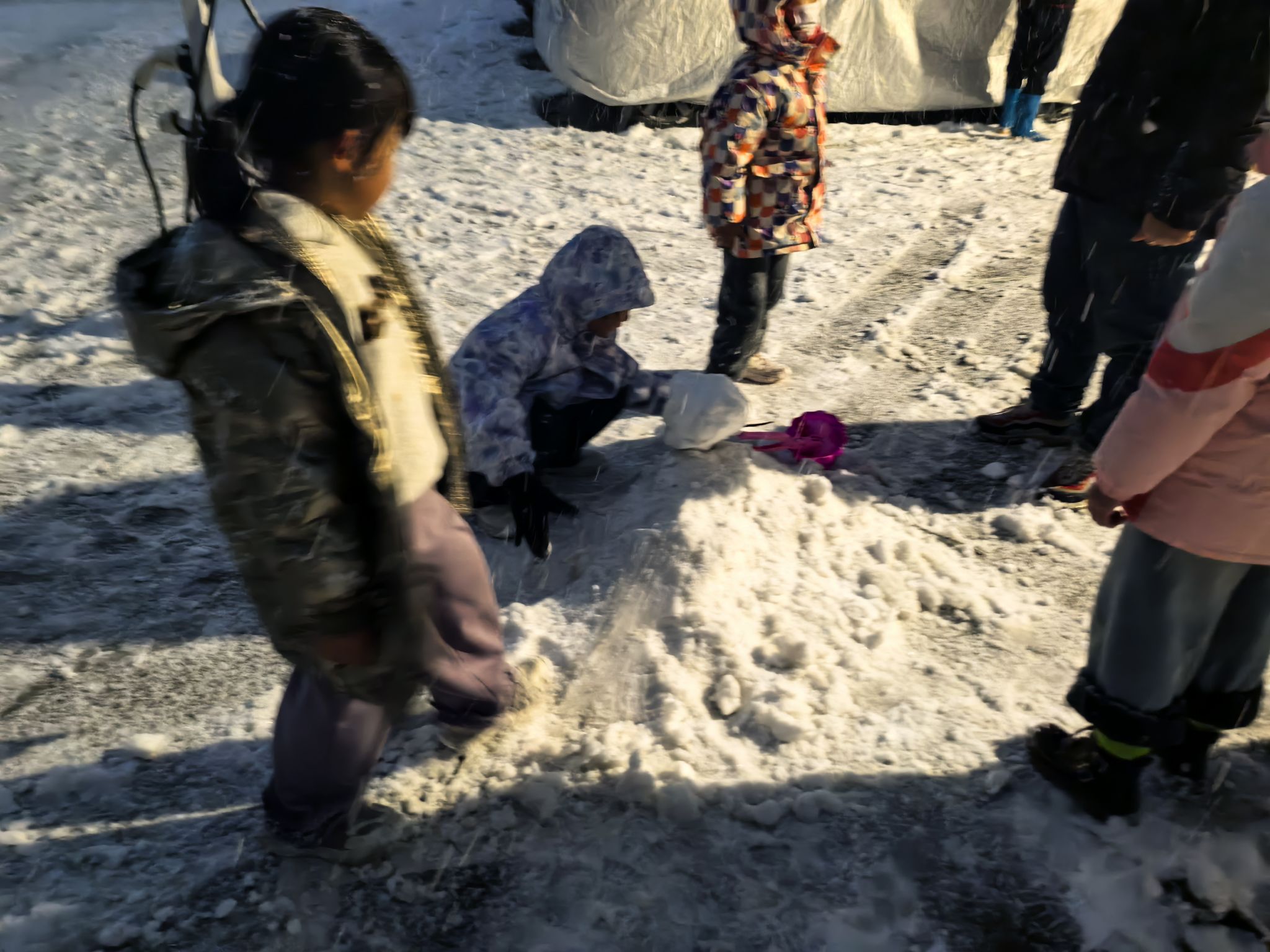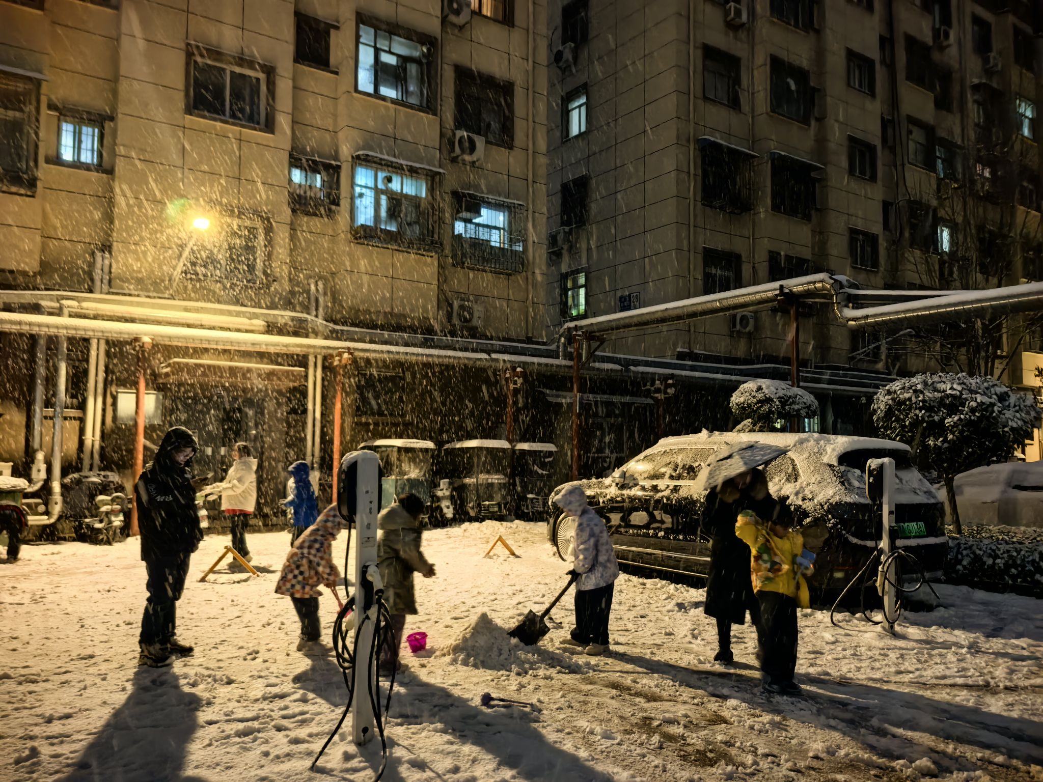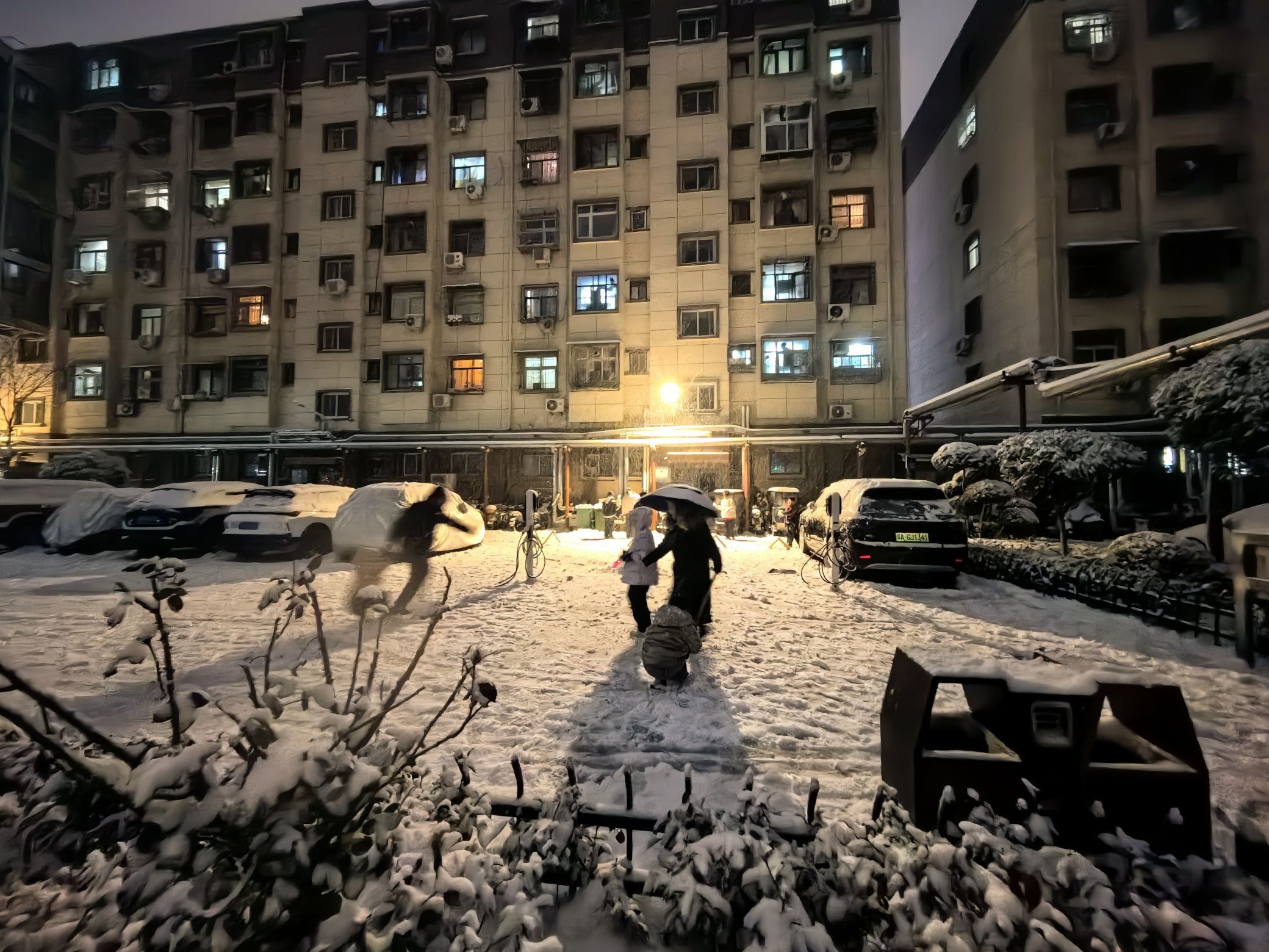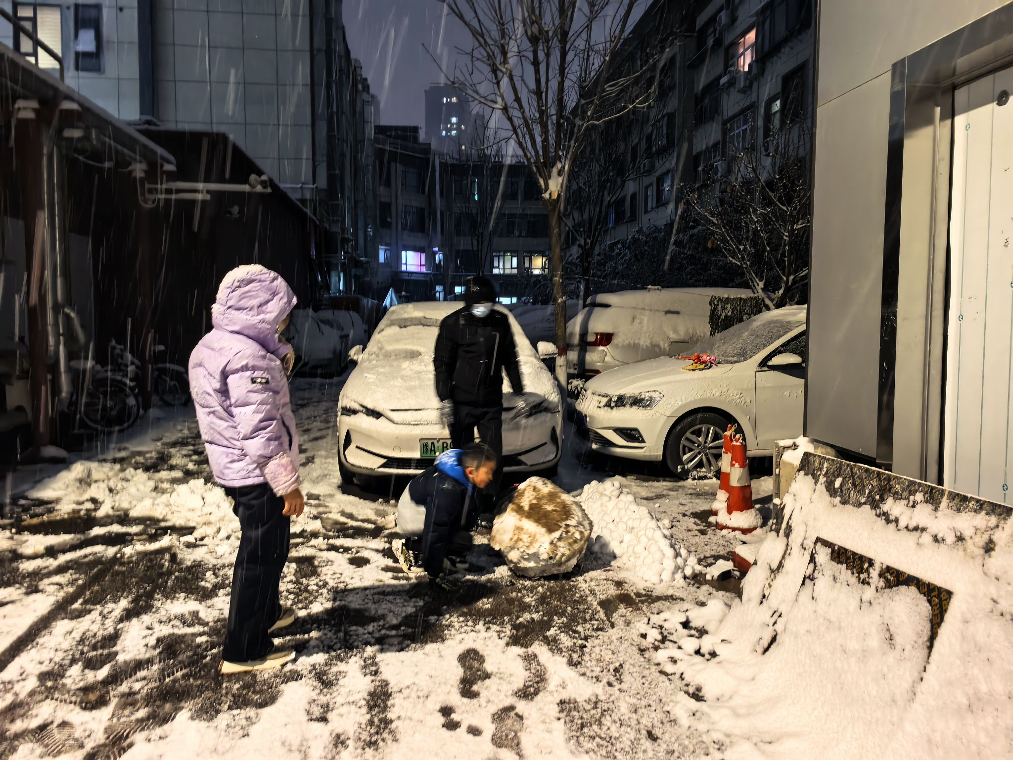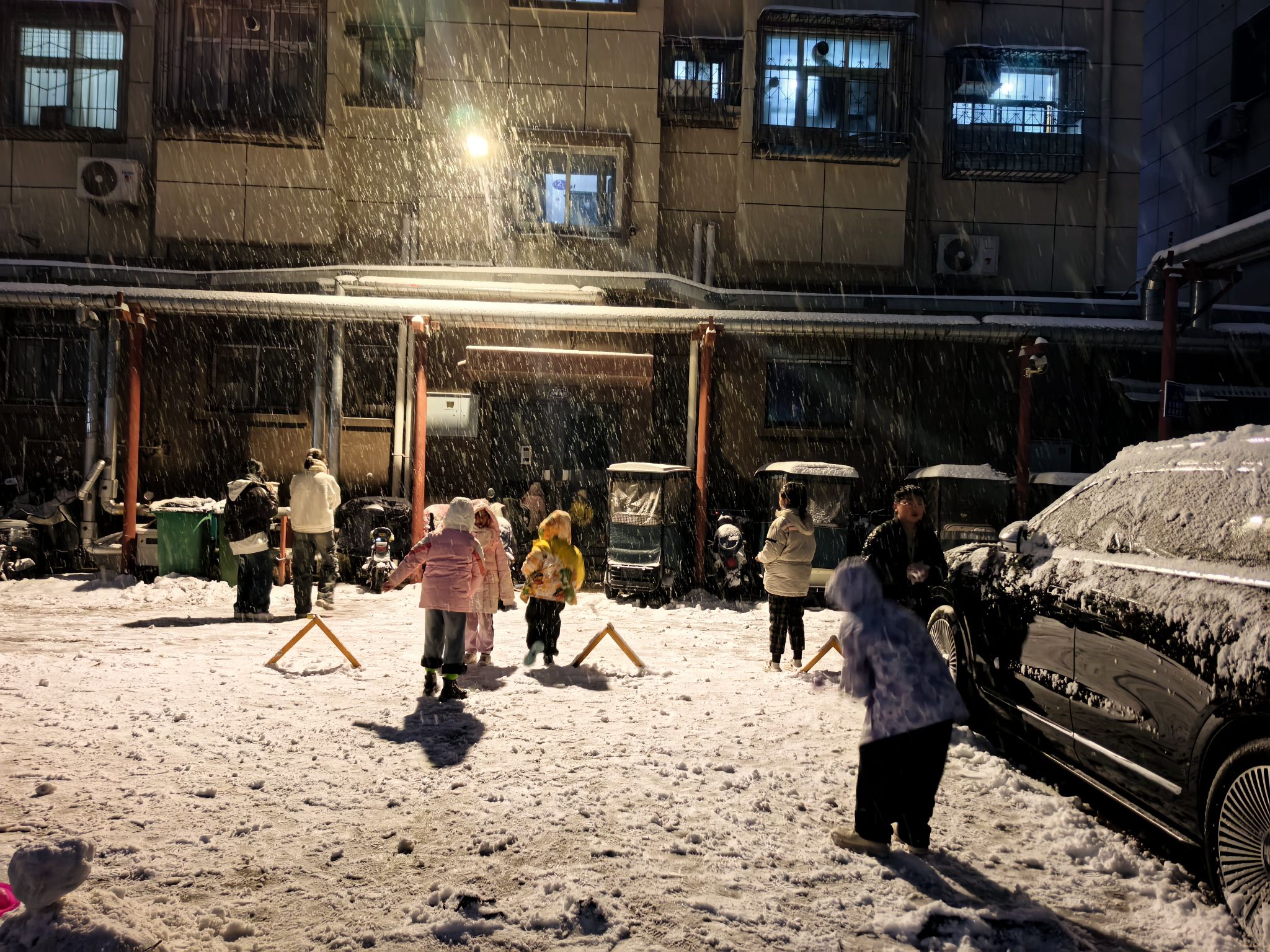 鄭州的初雪像撒了把糖霜,社區(qū)頓時(shí)變成游樂(lè)場(chǎng)。穿得像小棉球的孩子追著雪球跑,紅撲撲的臉蛋上沾著雪花,堆的雪人歪著胡蘿卜鼻子,沖萬(wàn)家燈火傻笑。