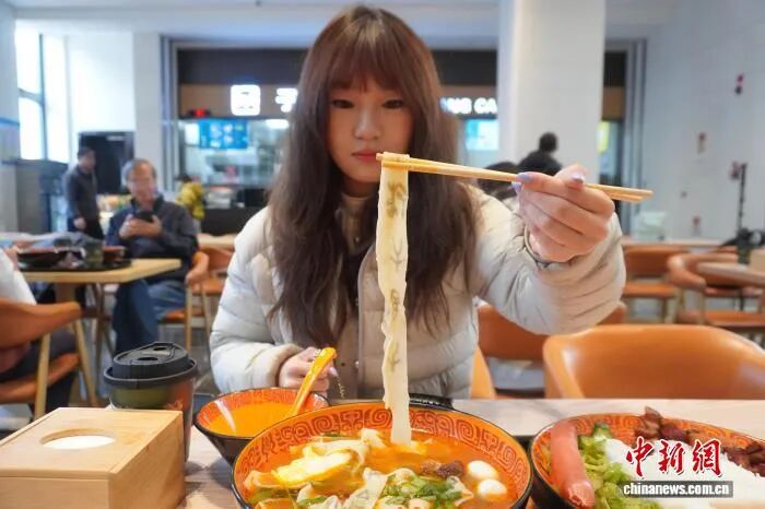 餐廳內(nèi),大學(xué)生游客薛冰點(diǎn)了一碗有“上岸成功”字樣的“甲骨文面條”,她夾起面條拍照分享至朋友圈一氣呵成,“這面條上的字吉利又喜慶”。