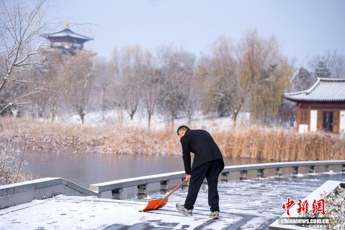12月13日,雄安悅容公園內工作人員正在除雪。中新社記者 韓冰 攝
