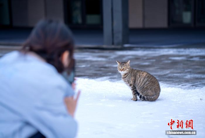 12月13日,雄安新區市民服務中心內市民正在給雪地中的小貓拍照。中新社記者 韓冰 攝