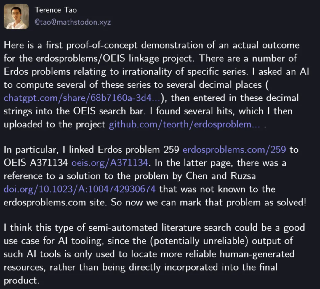 他借助GPT-5對相關數列進行高精度計算,隨后將得到的結果輸入OEIS(一個收錄全球數列的數據庫)進行檢索對照,進而發現部分Erd?s問題其實早已在既有研究中被解決——只是長期沒人注意到,未把結果與問題庫對應起來。