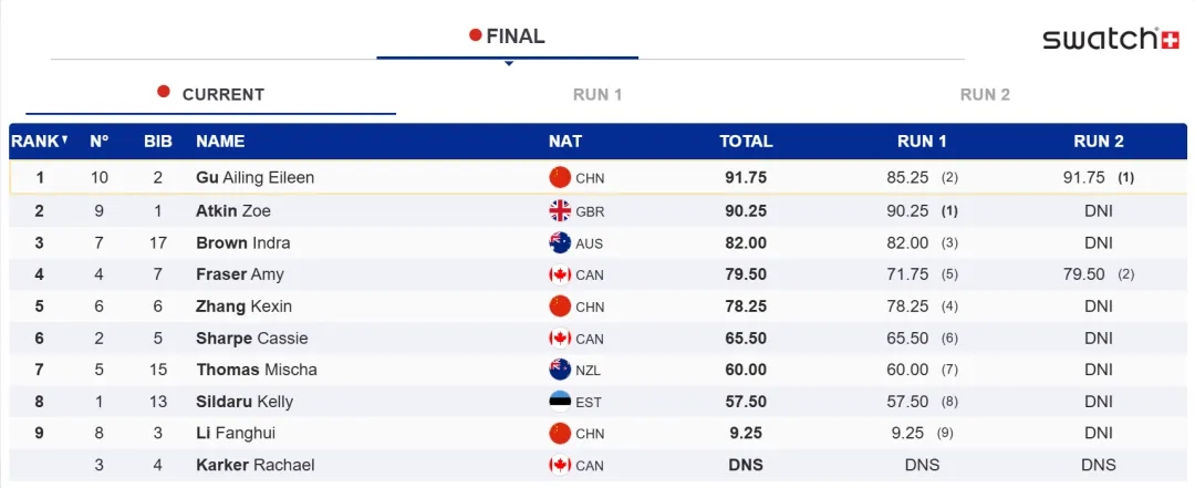 第二輪,張可欣在難度方面提升并不明顯,成績沒能超過第一輪,最終分數定格在78.25分。此后,李方慧出現失誤,雪板磕到了U型池的邊緣,最終排名第9。最后出戰的谷愛凌選擇了高難度動作,相較第一輪,提升了動作后程的高度,最終獲得91.75分。