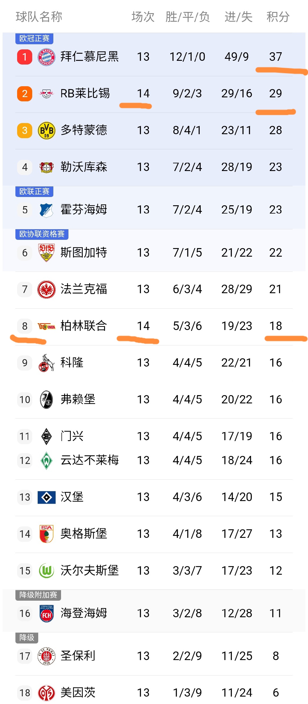 在這場比賽結束之后,我們看到先賽的萊比錫隊積29分落后榜首的拜仁8分,這顯然是拜仁的利好消息,而柏林聯合隊積18分暫時升至第8的位置。
