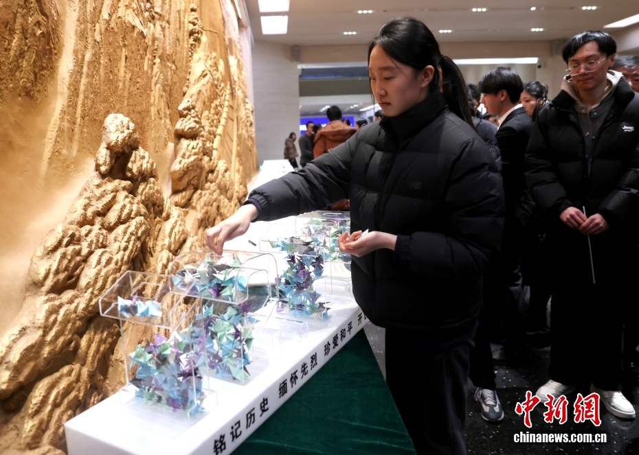 12月13日是第十二個南京大屠殺死難者國家公祭日,南京大屠殺死難者國家公祭儀式在侵華日軍南京大屠殺遇難同胞紀念館舉行,中國人民抗日戰爭紀念館在北京同步舉行悼念活動。圖為市民和學生折放千紙鶴祈愿和平。