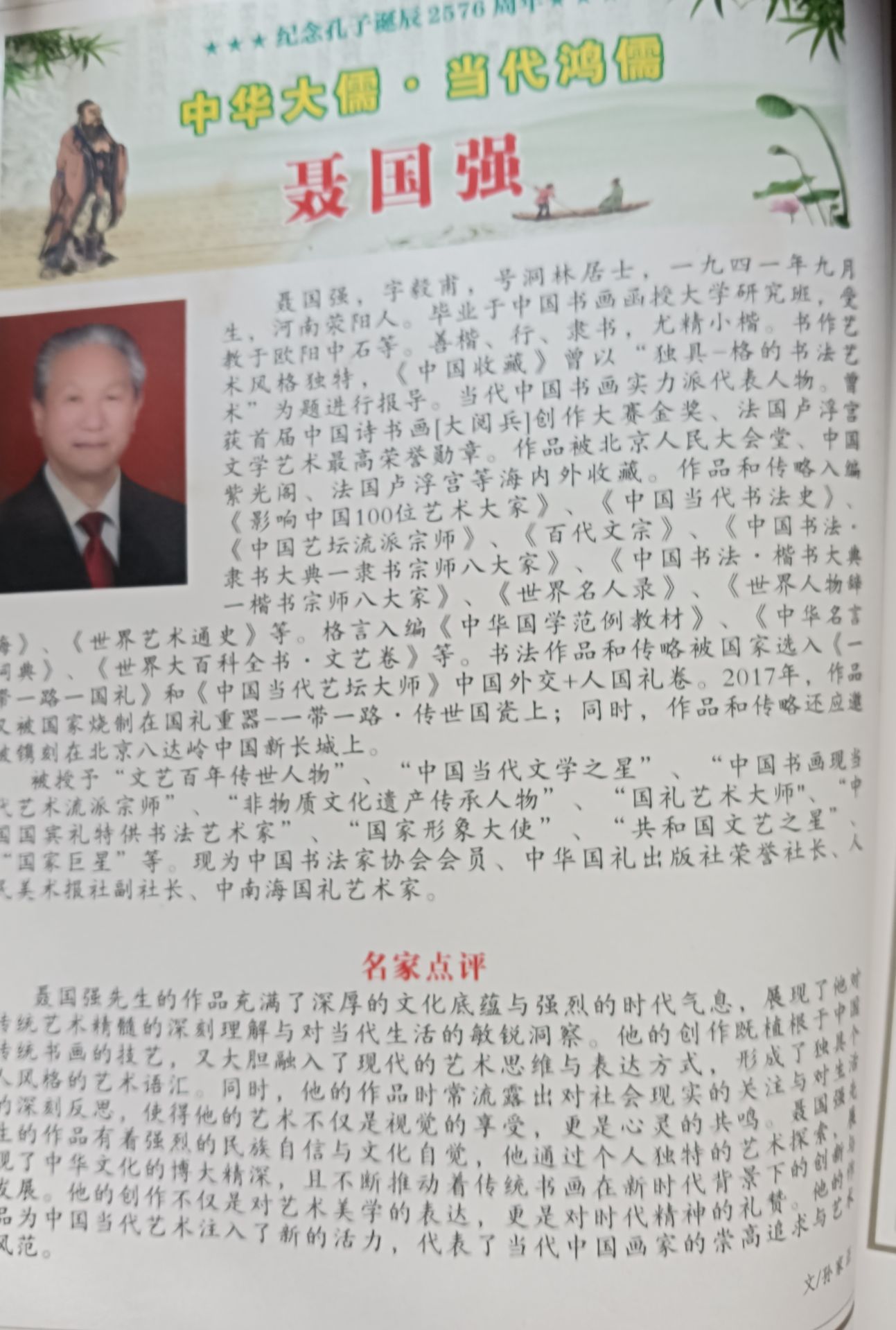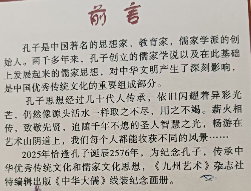 “孔子是中國(guó)著名的思想家、教育家,儒家學(xué)派的創(chuàng)始人。兩千多年來(lái),孔子創(chuàng)立的儒家學(xué)說(shuō)以及在此基礎(chǔ)上發(fā)展起來(lái)的儒家思想,對(duì)中華文明產(chǎn)生了深刻影響,是中國(guó)優(yōu)秀傳統(tǒng)文化的重要組成部分。 孔子思想經(jīng)過(guò)幾十代人傳承,依舊閃耀著異彩光芒,仍然像源頭活水一樣取之不盡,用之不竭。薪火相傳,致敬先賢,追隨千年不熄的圣人智慧之光,暢游在藝術(shù)大道上,我們每個(gè)人都能收獲不同的風(fēng)景…… 2025年恰逢孔子誕辰2576年,為紀(jì)念孔子,傳承中華優(yōu)秀傳統(tǒng)文化和儒家文化思想,《九州藝術(shù)》雜志社特編輯出版《中華大儒》線裝紀(jì)念畫冊(cè)。”