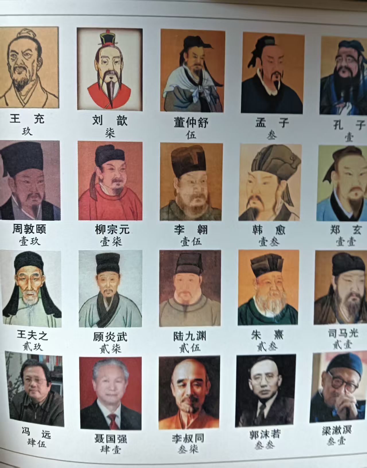 《中華大儒》載入的古近代文化“大儒”分別是:孔子、孟子、董仲舒、劉 歆 、王充、鄭玄、韓愈、李翔、柳宗元、周敦頤、司馬光、朱熹、陸九淵、顧炎武、王夫之、梁漱溟、郭沫若和李叔同。現(xiàn)代的只有聶國(guó)強(qiáng)和馮遠(yuǎn)二人。