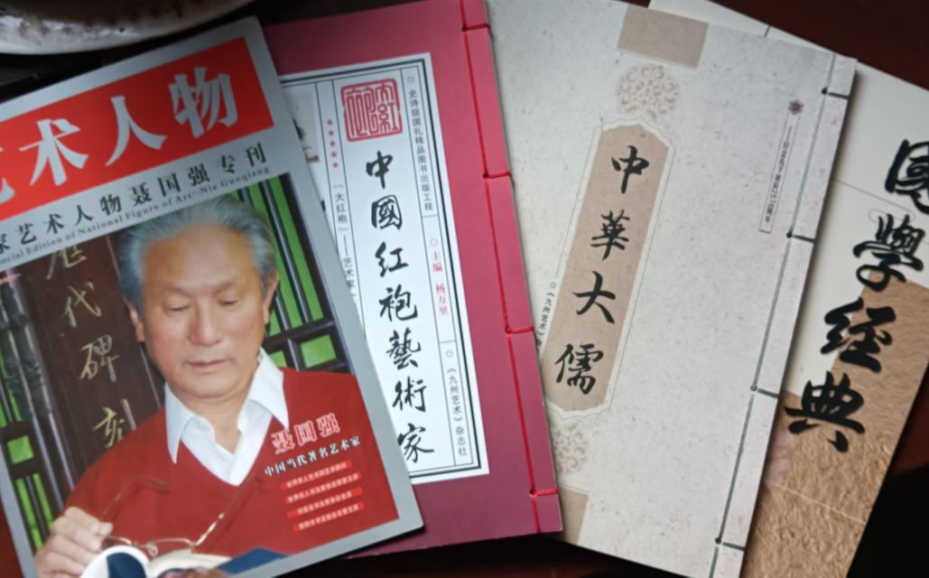 日前登門拜訪著名書法家聶國(guó)強(qiáng)先生,新發(fā)現(xiàn)他的案頭上又?jǐn)[上了四部書法藝術(shù)大典——《中華大儒》《藝術(shù)人物》《國(guó)學(xué)經(jīng)典》和《中國(guó)紅袍藝術(shù)家》等等。