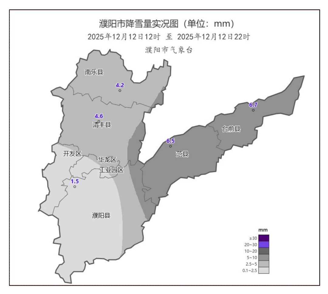 12日12時至22時,我市平均降雪量4.3毫米,各縣區純雪量(毫米)分別為:市城區2.1、濮陽縣1.5、清豐縣4.6、南樂縣4.2、范縣6.5、臺前縣6.7毫米;各縣區最大積雪深度(厘米)分別為:市城區1.0、濮陽縣1.0、清豐縣4.0、南樂縣4.0、 范縣4.0、臺前縣6.0厘米。