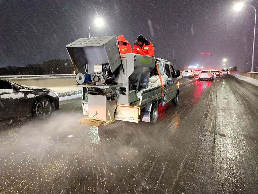 大慶路高架橋上撒布機正在潑灑工業鹽。 記者 高崟人 通訊員 ?程媛 邊祖勇 攝