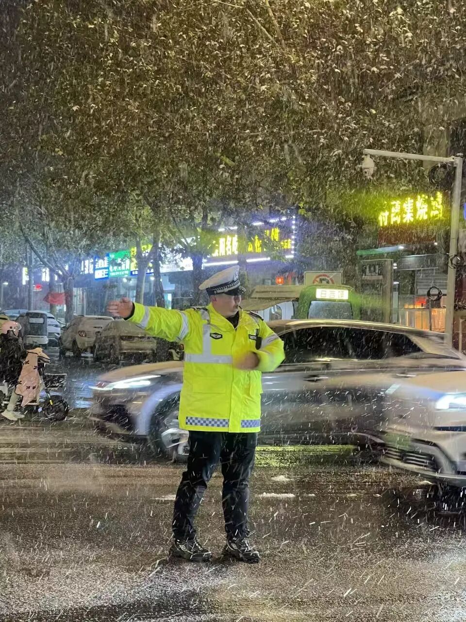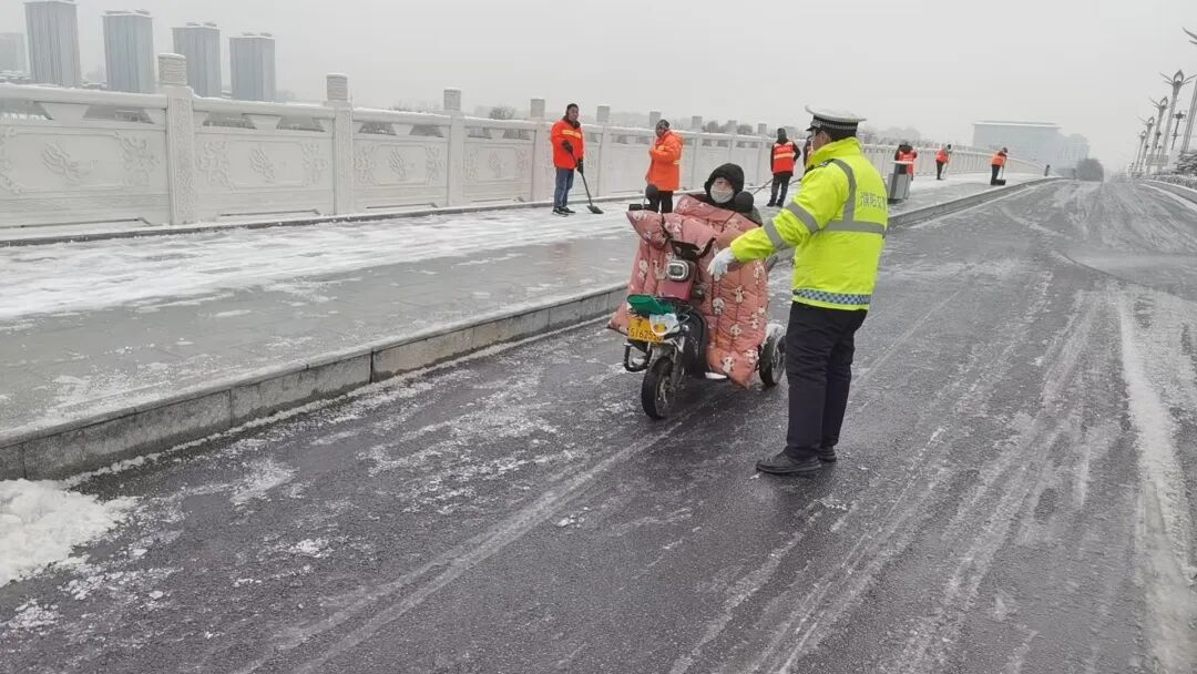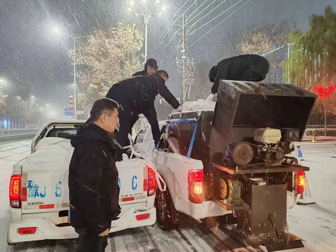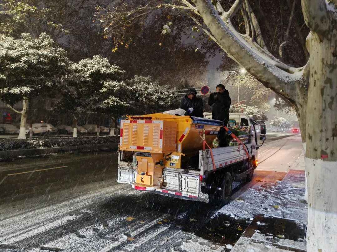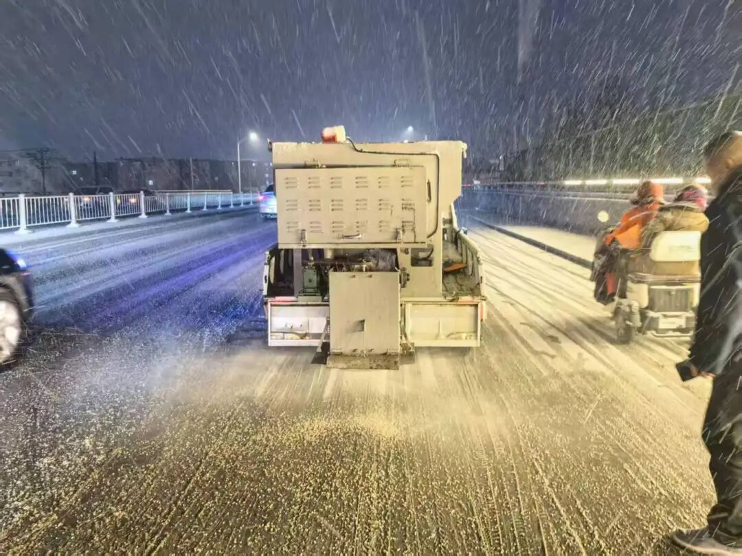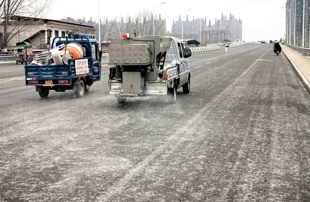 城管部門工作人員正在撒布融雪劑。記者 張迪 ?黃立 通訊員 孫曉英 攝