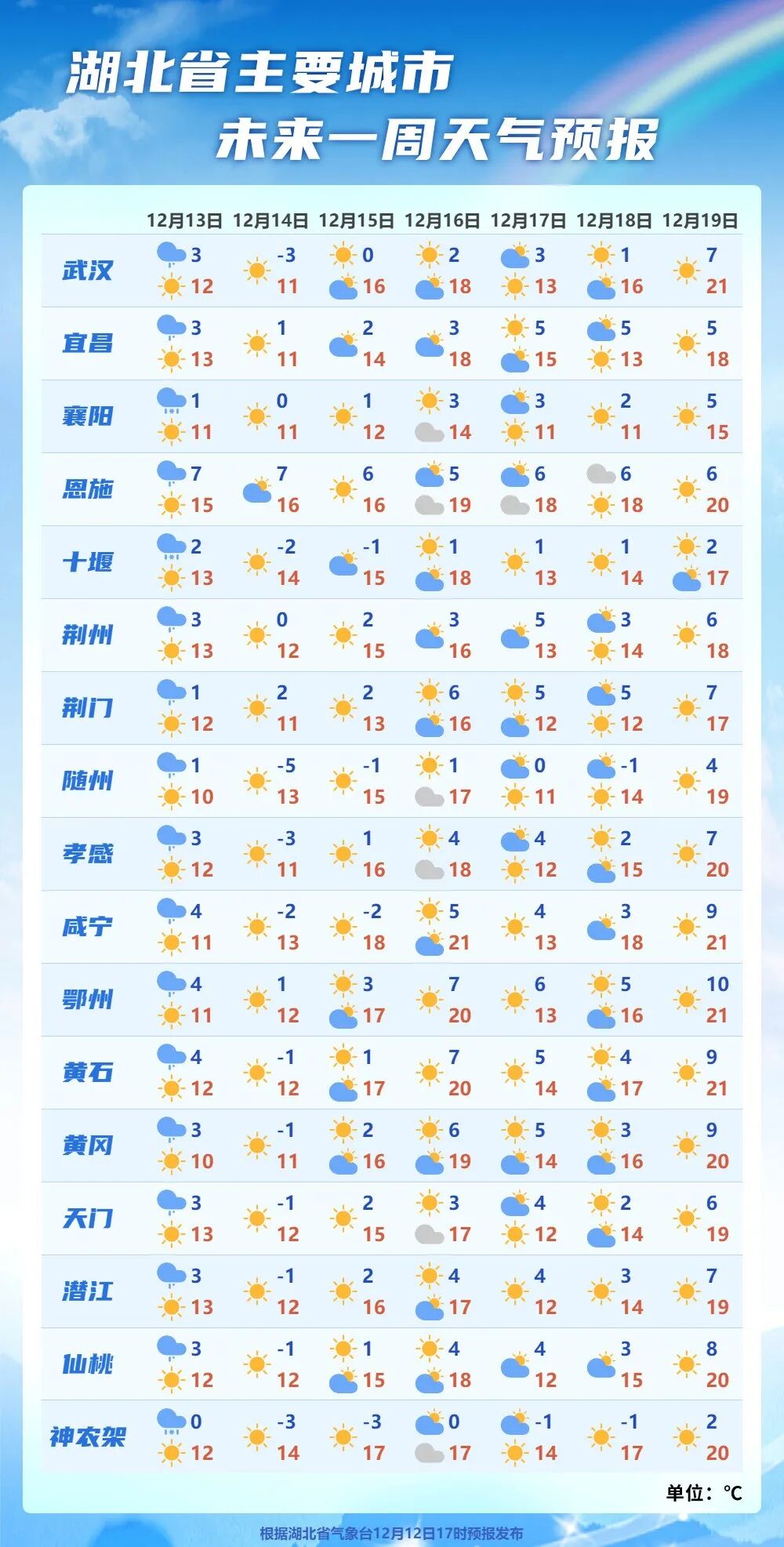 12月13日08時(shí)-14日08時(shí),鄂西南南部、鄂東南東部零星小雨轉(zhuǎn)多云,山區(qū)有雨夾雪或雪;其他地區(qū)多云到晴天。最高氣溫10~14℃,最低氣溫北部-5~-2℃、南部-2~3℃,偏北風(fēng)3到5級(jí)、陣風(fēng)5到9級(jí),晚上轉(zhuǎn)2到3級(jí)。