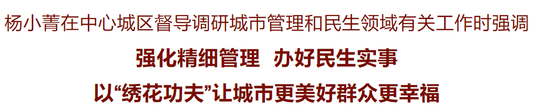12月13日,市委書記楊小菁到中心城區督導調研城市管理和民生領域有關工作,強調要深入學習貫徹黨的二十屆四中全會精神,認真落實省委十一屆十次全會、市委八屆十次全會部署要求,始終堅持“人民城市人民建,人民城市為人民”,以“繡花功夫”推進城市精細化管理工作,用心用情解決好群眾急難愁盼問題,讓城市更加美好、群眾更加幸福。