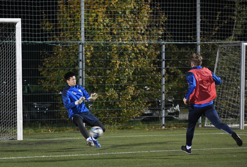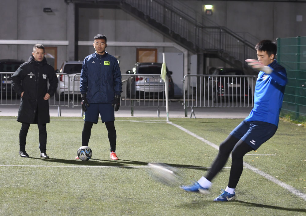 10月22日,格勒迪希隊球員郭晨希(左)跟隨球隊在奧地利薩爾茨堡訓練。新華社記者 賀燦鈴 攝